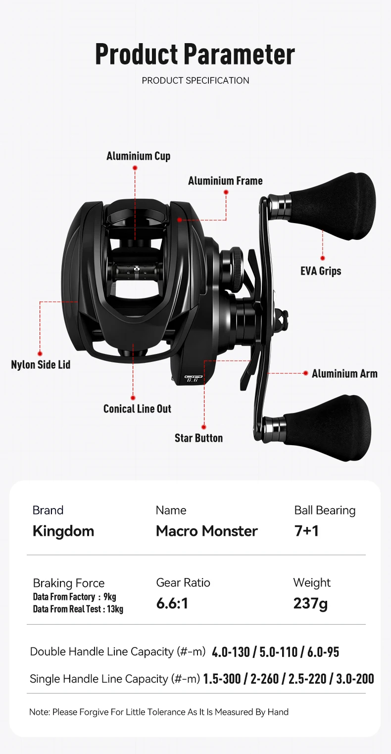 Kingdom MACRO Monster Baitcasting Reel Aluminum Frame 6.6:1 Gear Ratio 13KG Max Drag 7+1BB Reel For Freshwater Saltwater Fishing