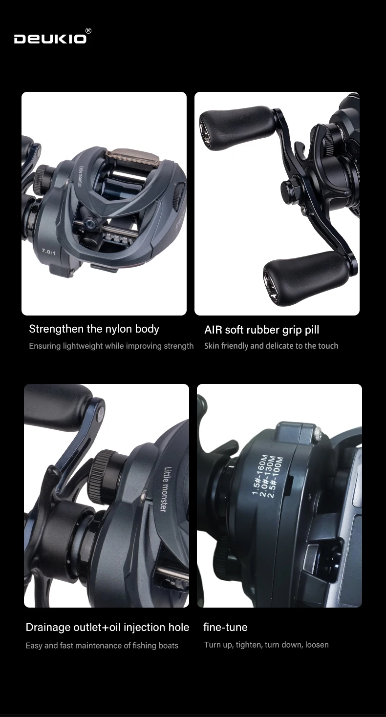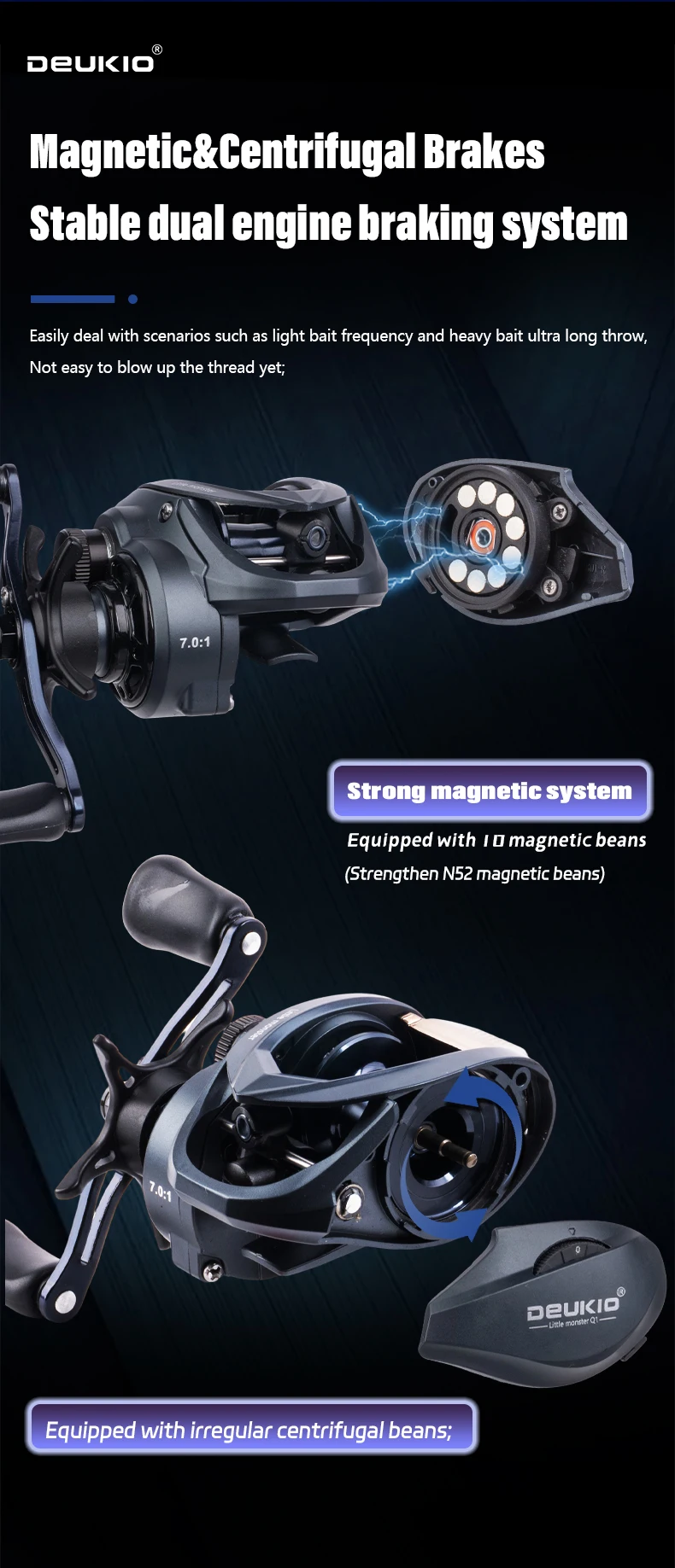 4.El sistema de freno de doble motor estable con freno magnético y centrífugo puede manejar fácilmente situaciones como la frecuencia del cebo ligero y el lanzamiento ultralargo de cebo pesado, y no es fácil explotar la línea.