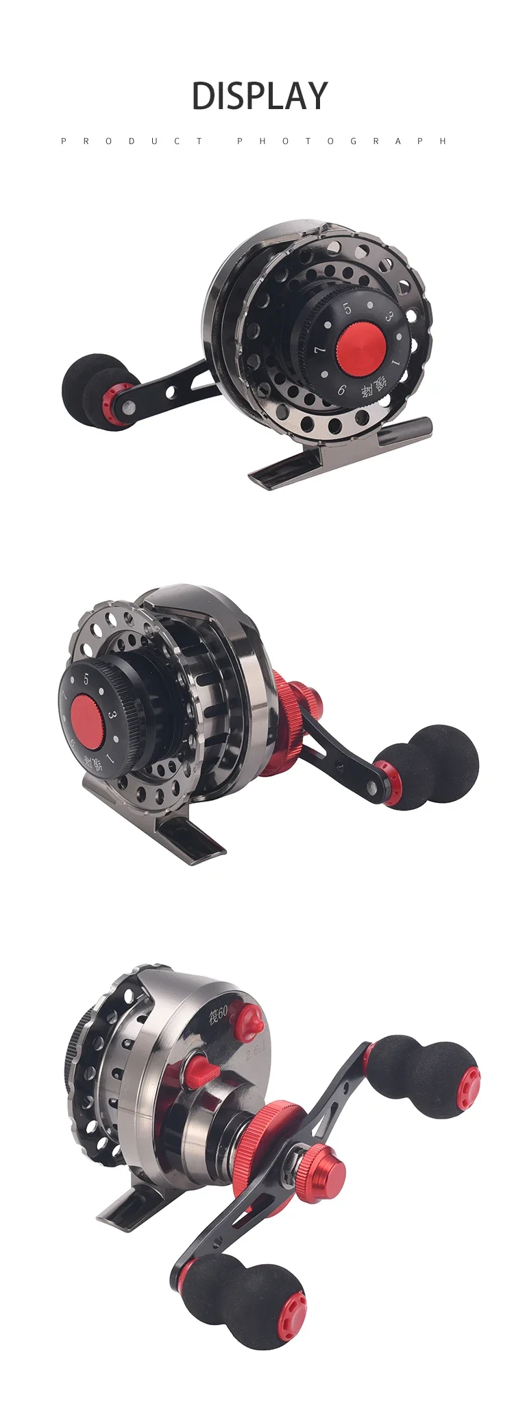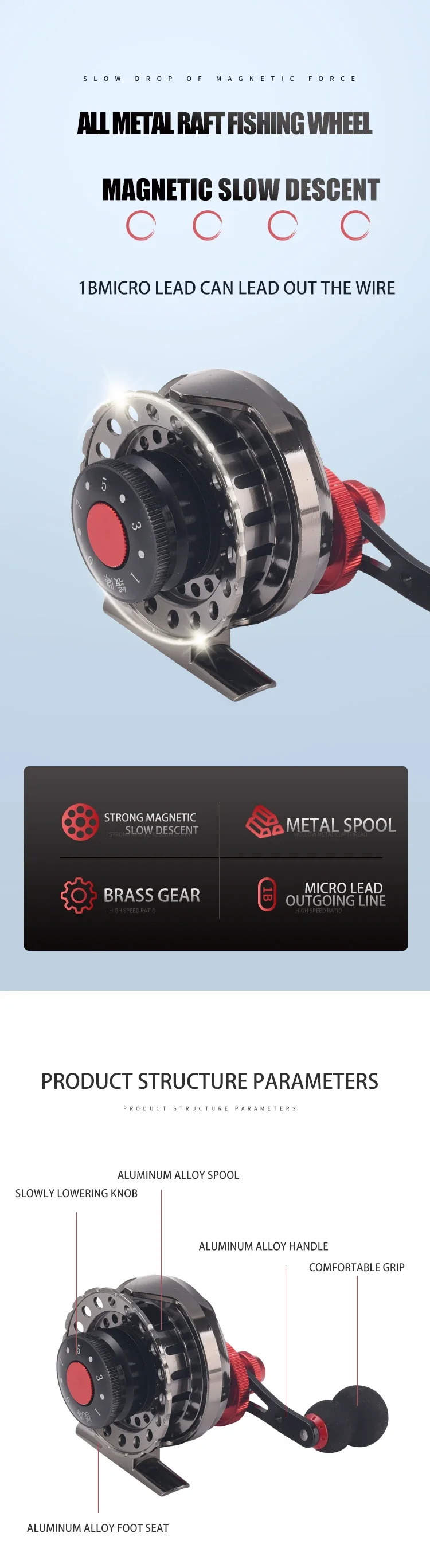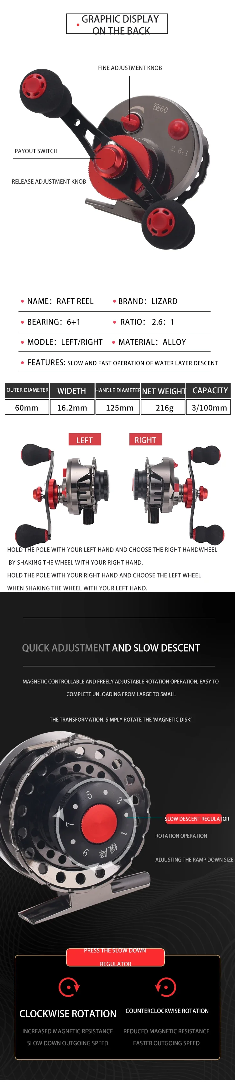 Carrete de balsa totalmente metálico Lizard con mango de carrete de aleación de aluminio y soporte de pie, relación de velocidad 2,6:1, rodamiento 6+1