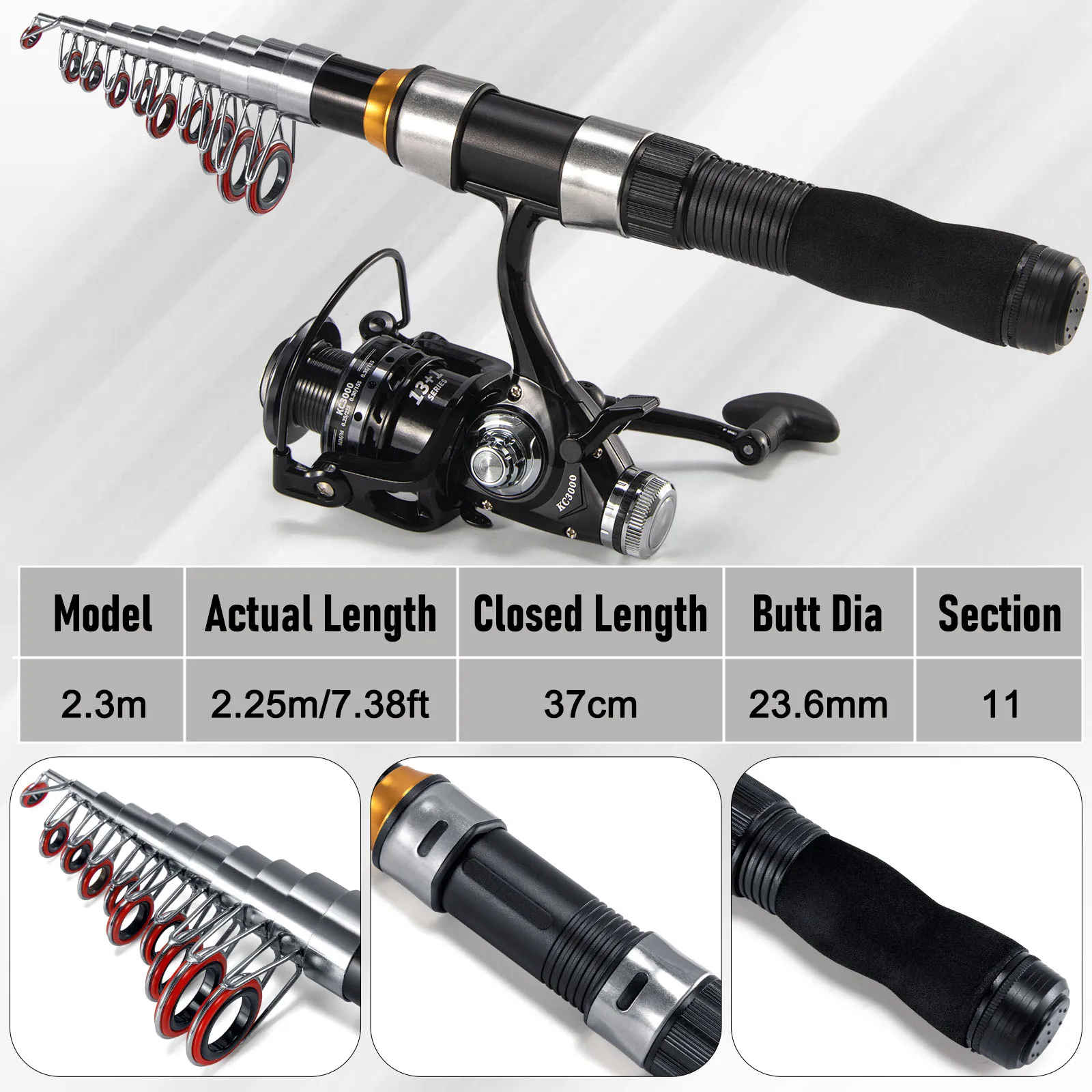 [Varilla de 2,3 m]: cuerpo de varilla de fibra de vidrio, asiento de carrete de ABS + acero inoxidable.El cuerpo de la varilla gruesa puede manejar cualquier carpa grande fácilmente.Guías cerámicas para reducir la fricción y no dañar el hilo de pescar.