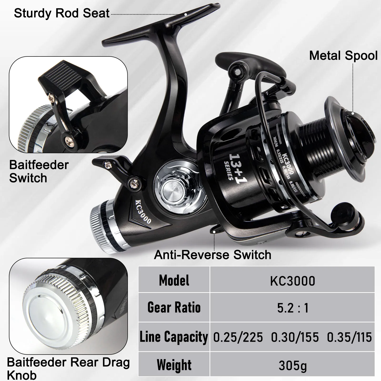 [Carretilla de cebo Runner]: el cuerpo principal está hecho de material totalmente metálico con engranajes compatibles con precisión y relación de transmisión 5,2:1 para un rendimiento suave.El carrete está equipado con asas metálicas intercambiables plegables hacia la izquierda y hacia la derecha.Capacidad de línea (mm/m) 0,25/225 0,3/155 0,35/115, peso 305 g. ¡El sistema Baitfeeder es ideal para la pesca de carpas!