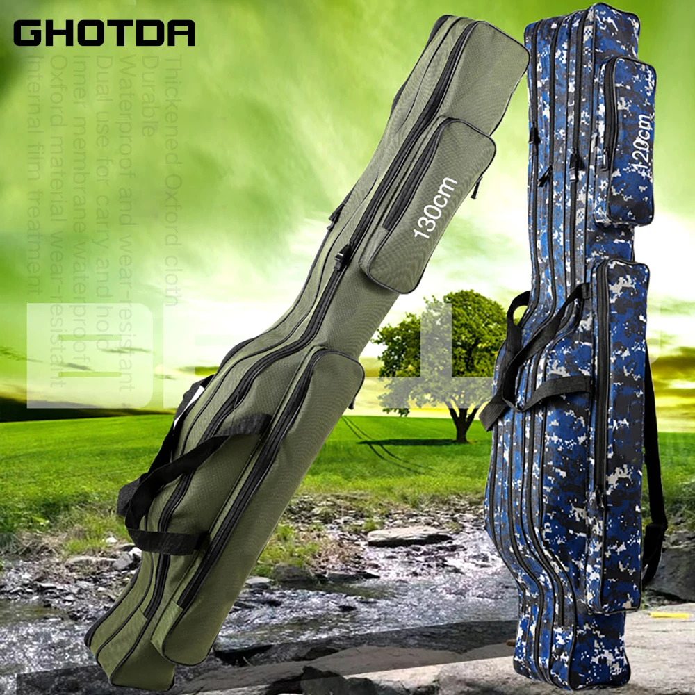 CaracterísticasHecho de lona, resistente al agua y al desgaste, muy duradero.Contiene dos o tres compartimentos principales con bolsillos laterales.Gran capacidad y correas ajustables, convenientes y portátiles.Maravilloso compañero para pescadores.Las especificacionesMaterial: 1280D de lonaColor: verde/azul (opcional)Capa: dos/tres (opcional)Longitud: 110cm / 120cm / 130cm / 150cm (opcional)Lista de paquetes1 ud. * bolsa de pesca