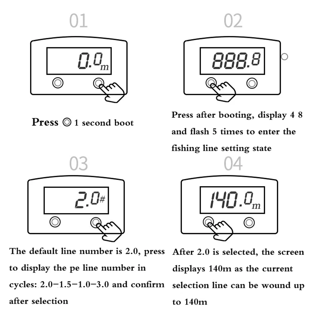 Con función de contador de línea, la pantalla digital mide la longitud de la línea en metros y el número de bobinado de línea.