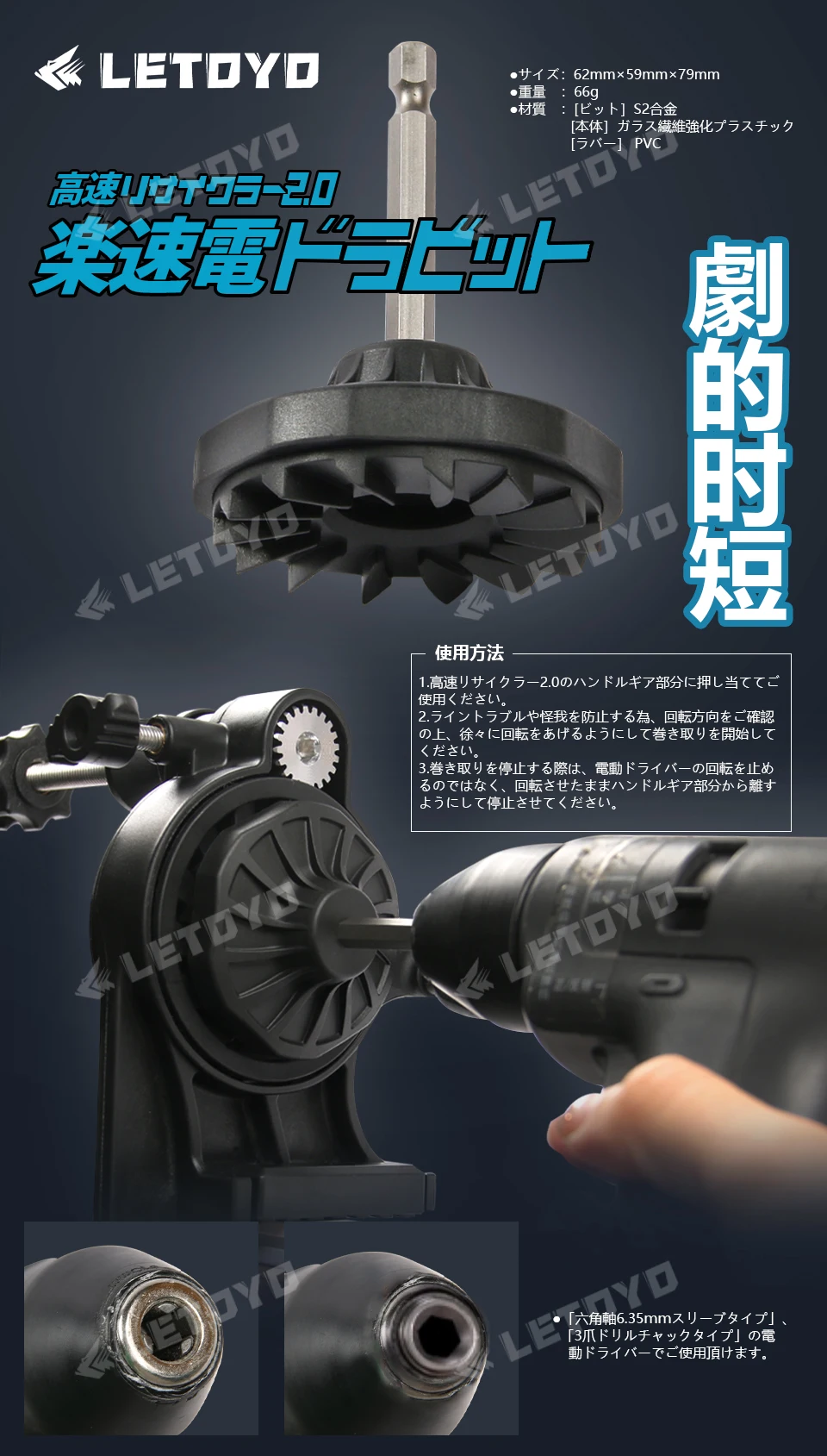 4.Se puede utilizar con destornilladores eléctricos tipo manguito con un eje hexagonal de 6,35 mm de largo y destornilladores eléctricos tipo portabrocas de tres mordazas.