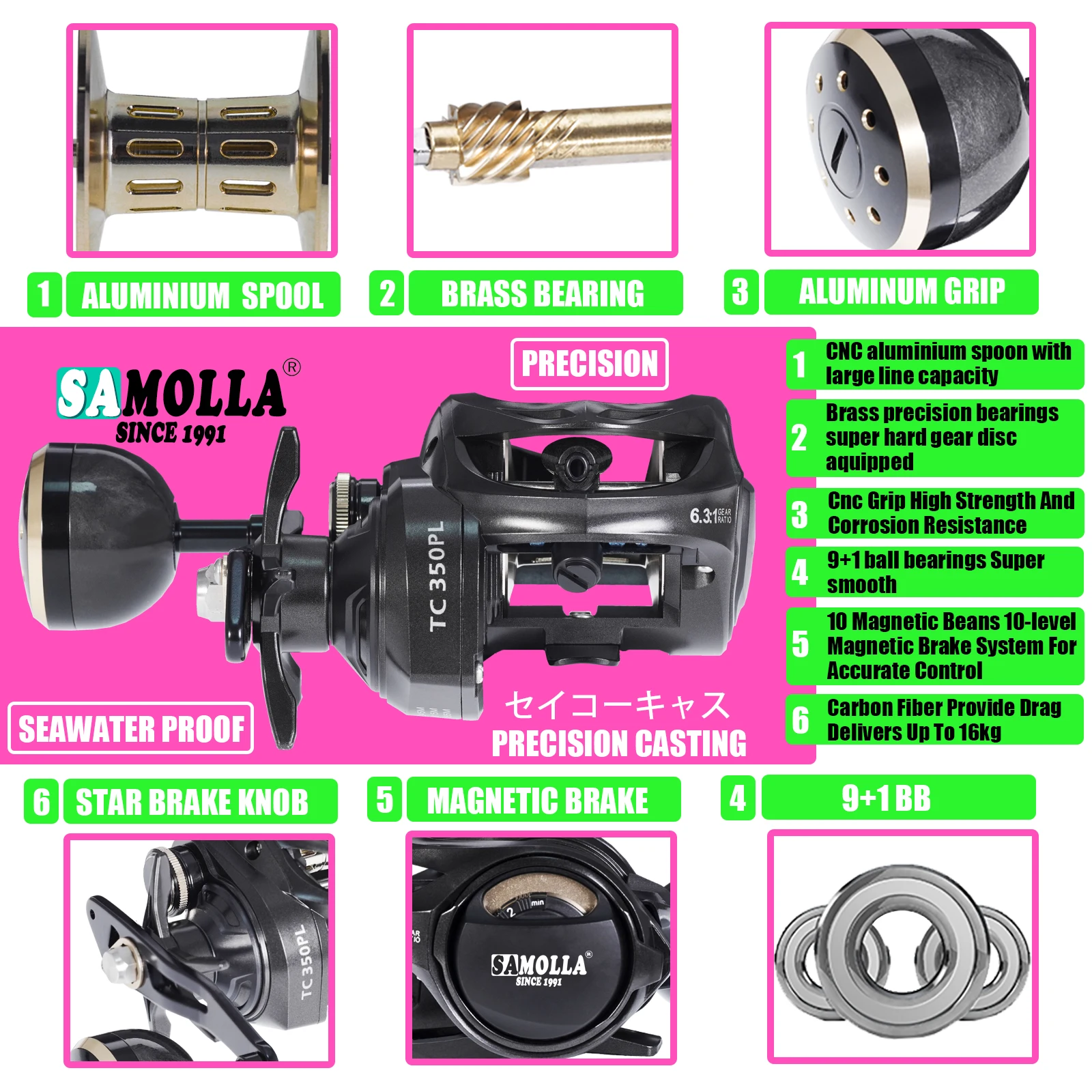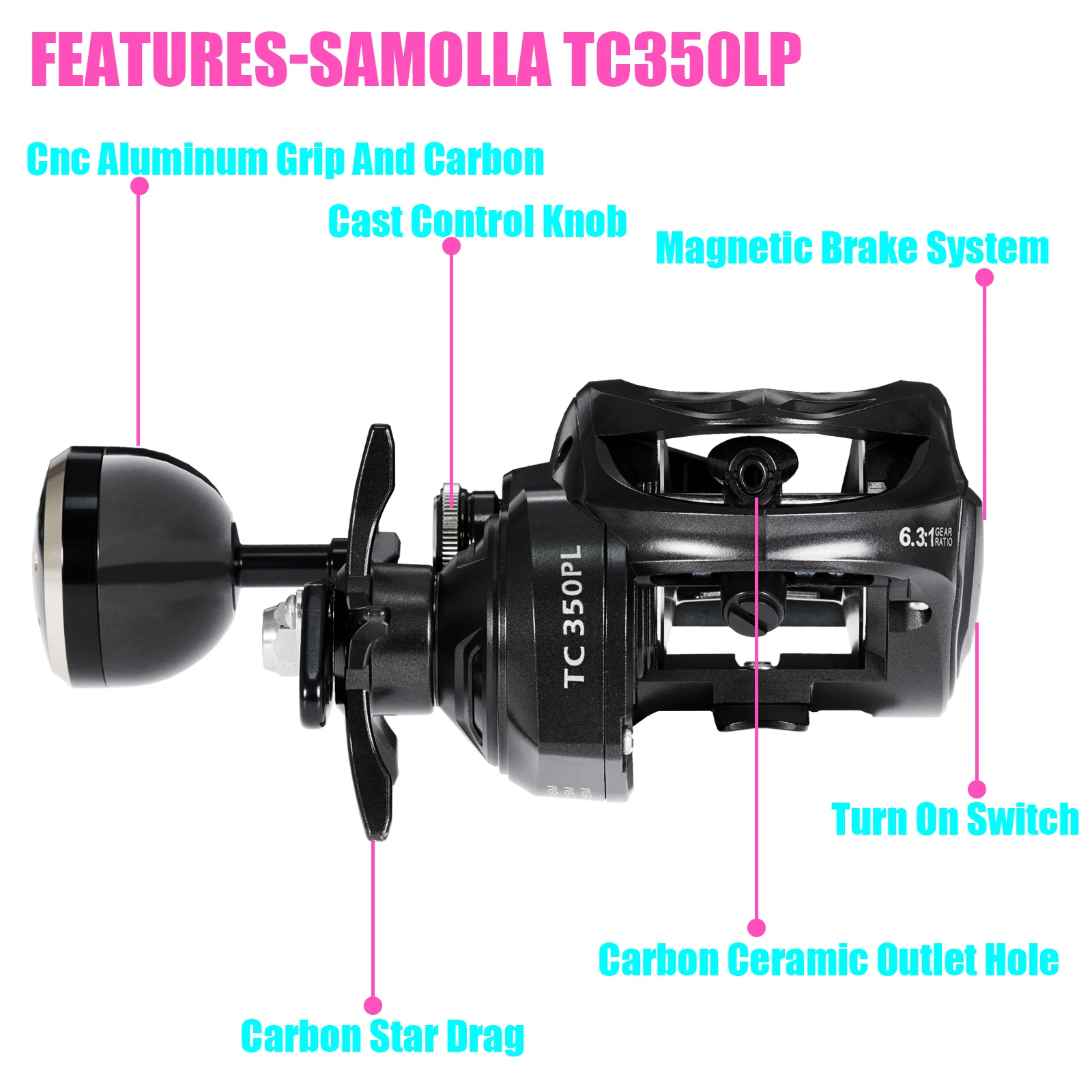 5. Ergonómico e innovador: El carrete de cebo Samolla TC350LP viene con un botón de enganche de barra de pulgar de fácil acceso en la placa lateral del engranaje que le ayuda a retroceder la barra de pulgar sin girar el mango. El carrete de envoltura de línea súper resistente elimina el uso de mono como respaldo. El sistema de guía de línea de soporte de ejes dobles aumenta en gran medida la estabilidad y la durabilidad. 10 sistema efectivo de frenado magnético evita los excesos y el contragolpe. Almohadilla de barra de pulgar envuelta en el interior