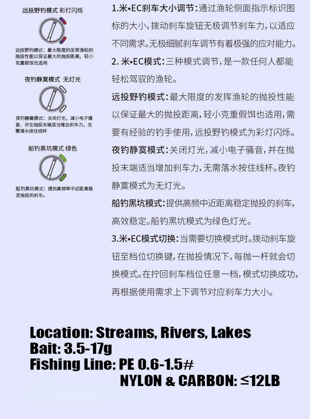 Modo de pesca de larga distancia: las luces coloridas parpadeantes maximizan el rendimiento de lanzamiento del carrete para garantizar la máxima distancia de lanzamiento.También es adecuado para señuelos ligeros y pesados.Se requieren pescadores experimentados.El modo de pesca salvaje de lanzamiento largo muestra luces de colores intermitentes.