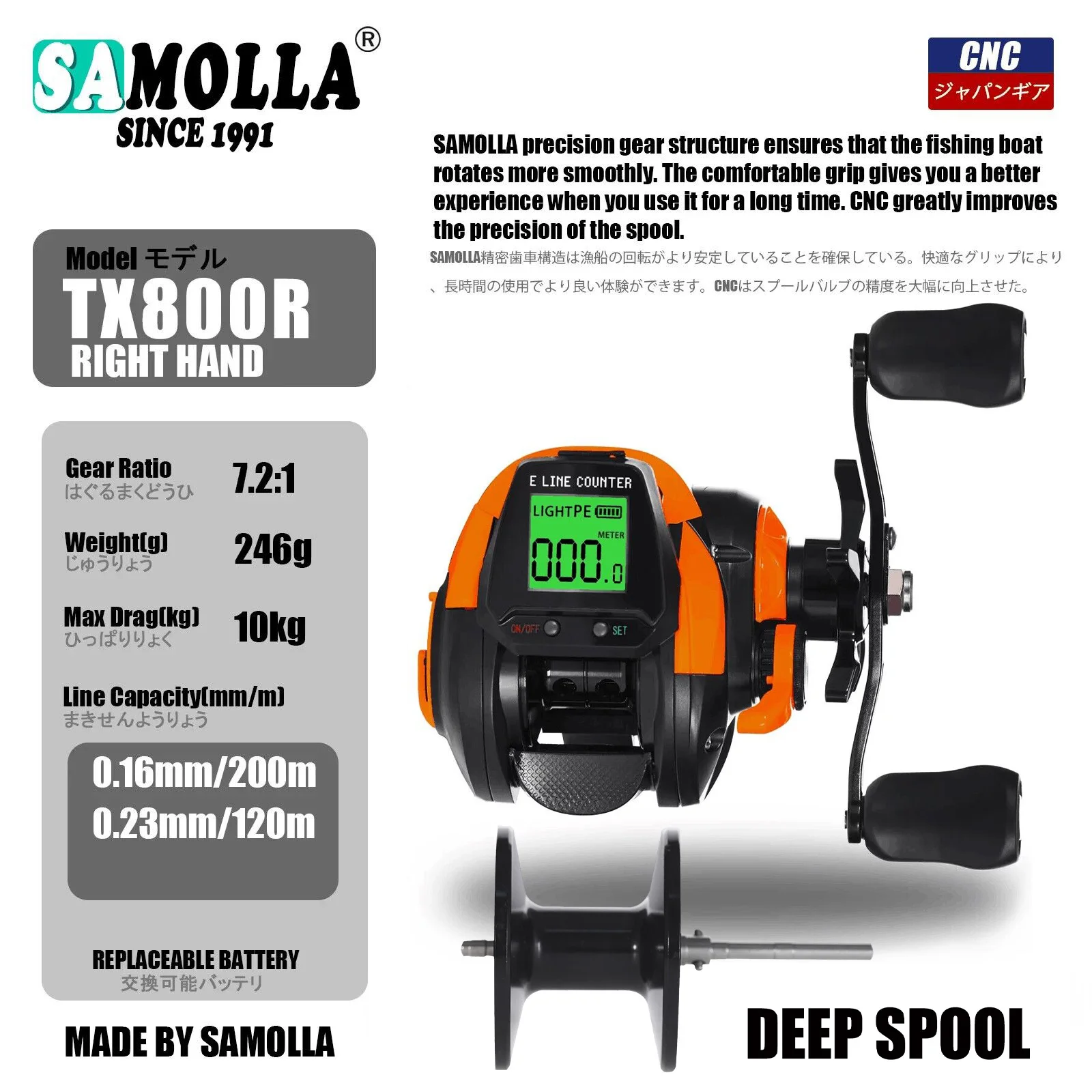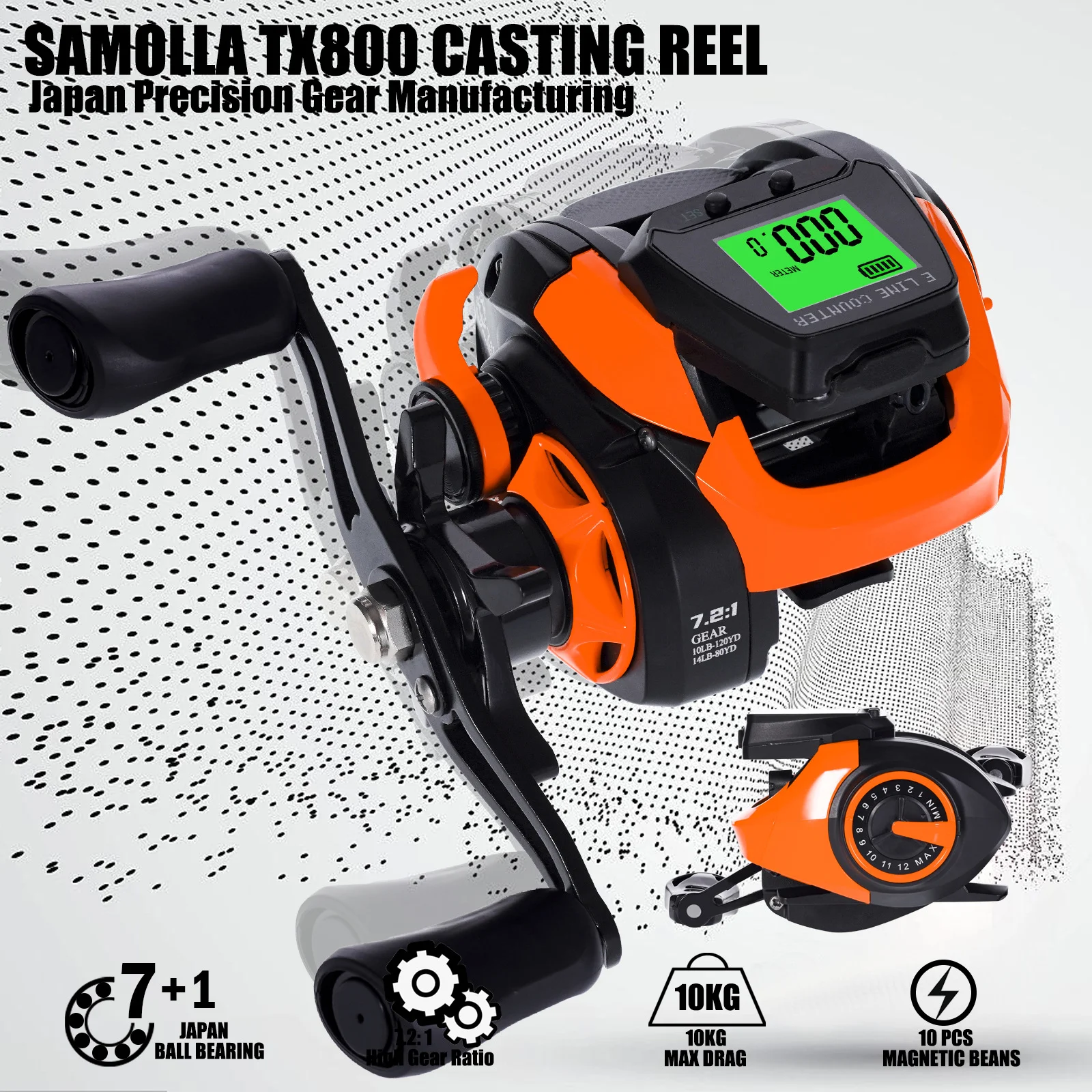 TX800| Relación de engranajes: 7,2:1| Peso: 246 g| Rodamientos: 7+1BB| Arrastre máximo: 10 kg| Capacidad de línea: 0,16 mm-200 M, 0,23-120 M