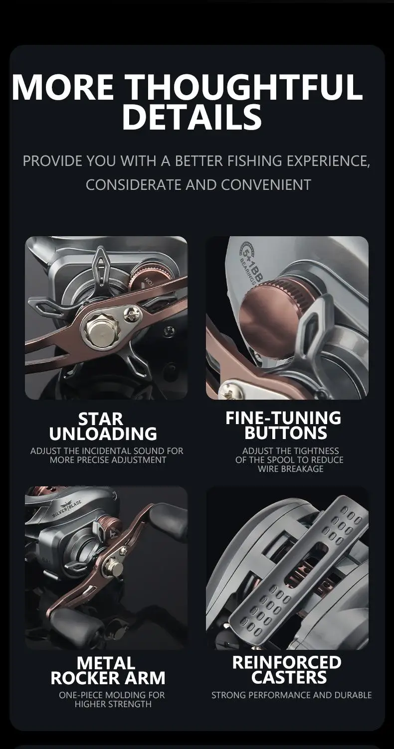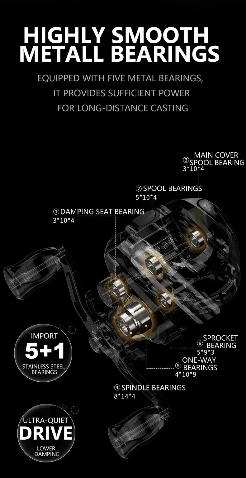 Los rodamientos de acero inoxidable cortan el esfuerzo de lanzamiento con un 50 % + frenos centrífugos garantizan una precisión milimétrica.¡Incluso los principiantes enganchan peces mandarines y lubinas como profesionales!