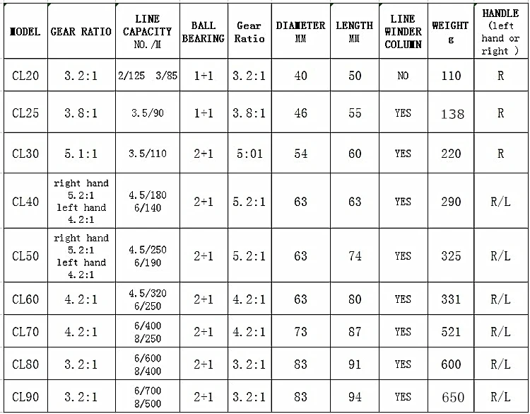 CL20 BB1+1, is very small reel ,which has no winder column and no alarm button. CL20 size:diameter40mm , length A 47mm , length B 92mm. CL25 has no alarm button ,but it has winder column. CL30/40/50/60 BB 2+1, is for powerful rod or boat fishing rod, which is double handle. CL 70/80/90 BB 2+1, is for ocean boat fishing or trolling fishing, is single handle with big egg shape knob.