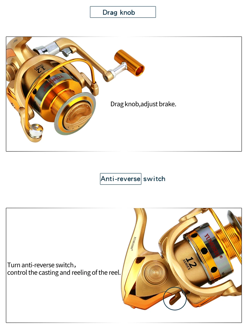 4. Carrete de cromo: sedal resistente al desgaste, suave y no se daña fácilmente, rodamiento de bolas de acero inoxidable equipado con 1, con una relación de transmisión de 5,2: 1.