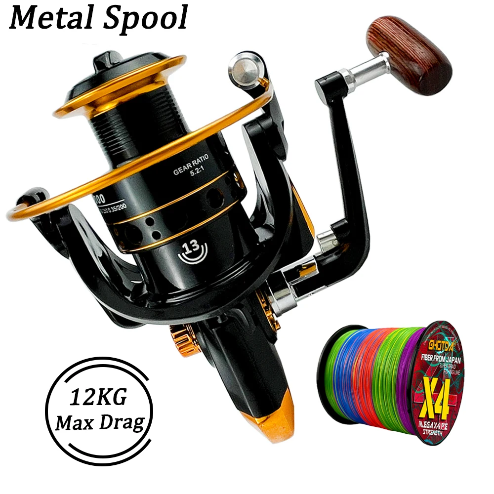 Carrete giratorio de arrastre máximo de 12KG para carrete de pesca con mango de carrete de Metal, plantilla de mar, carrete de carpa, rueda de bobina de pesca con línea de PE