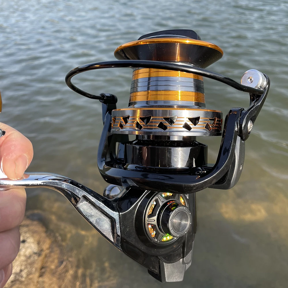 CARACTERÍSTICAS1.Súper fuerza de arrastre, máx.arrastrar 30kg.2.Brazo de roca CNC, plegado en contraste y fuerte fuerza de tracción.3.Copa de alambre de tiro largo biselado, la salida del hilo es más suave y no daña el hilo de pescar
