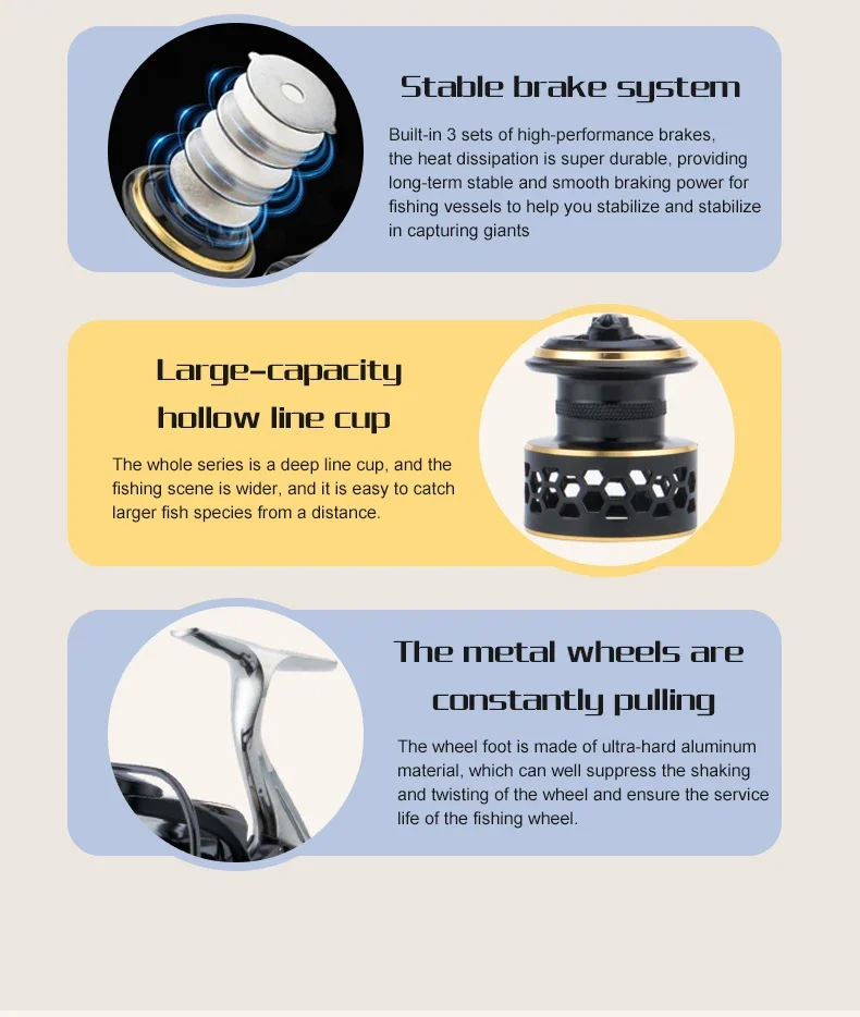 Estos carretes de pesca marina están fabricados con material de calidad.Bobina de aleación ligera CNC, eje principal de metal endurecido, engranaje principal de aleación de zinc y piñón mecanizado con precisión, duradero, anticorrosión, de alta resistencia sin deformación.