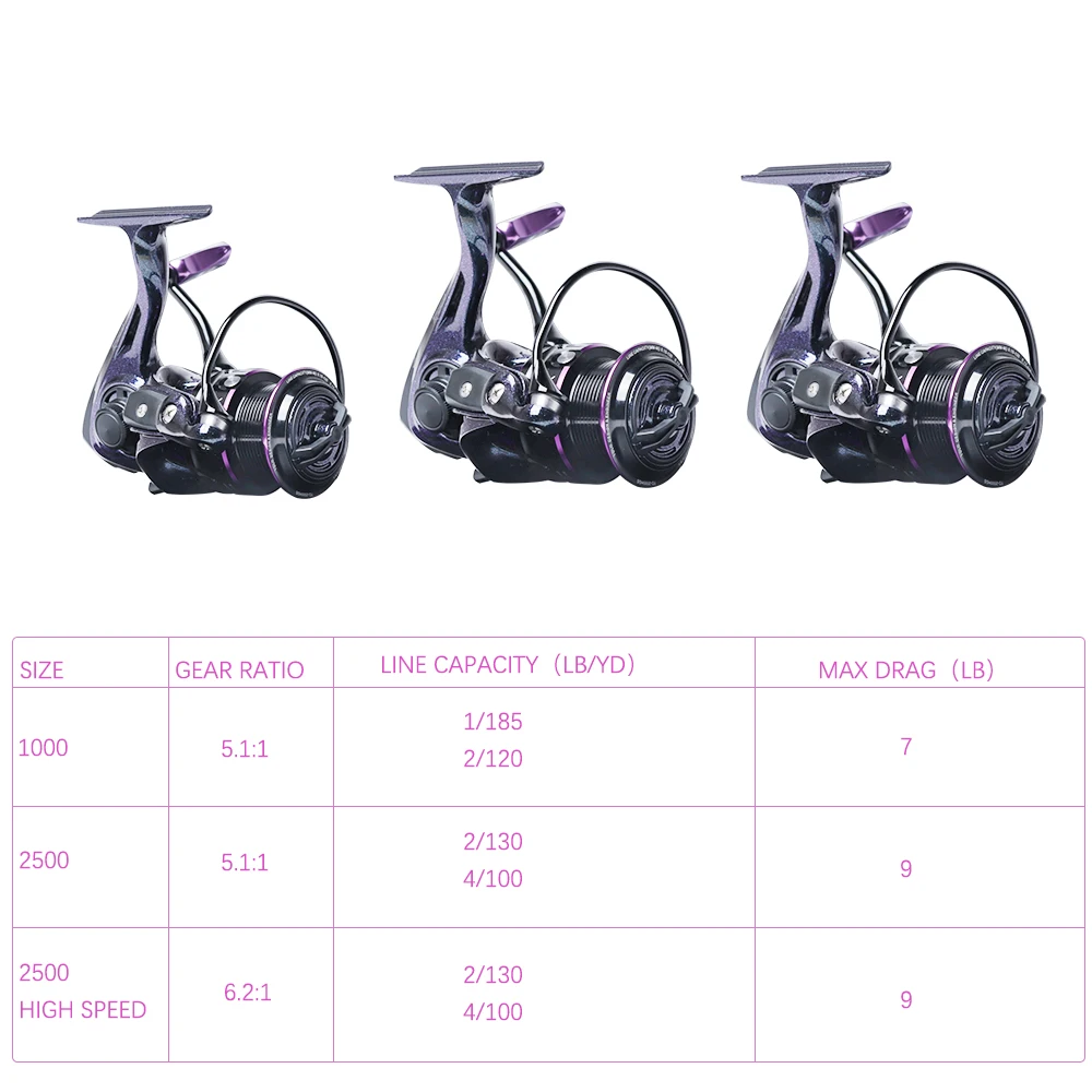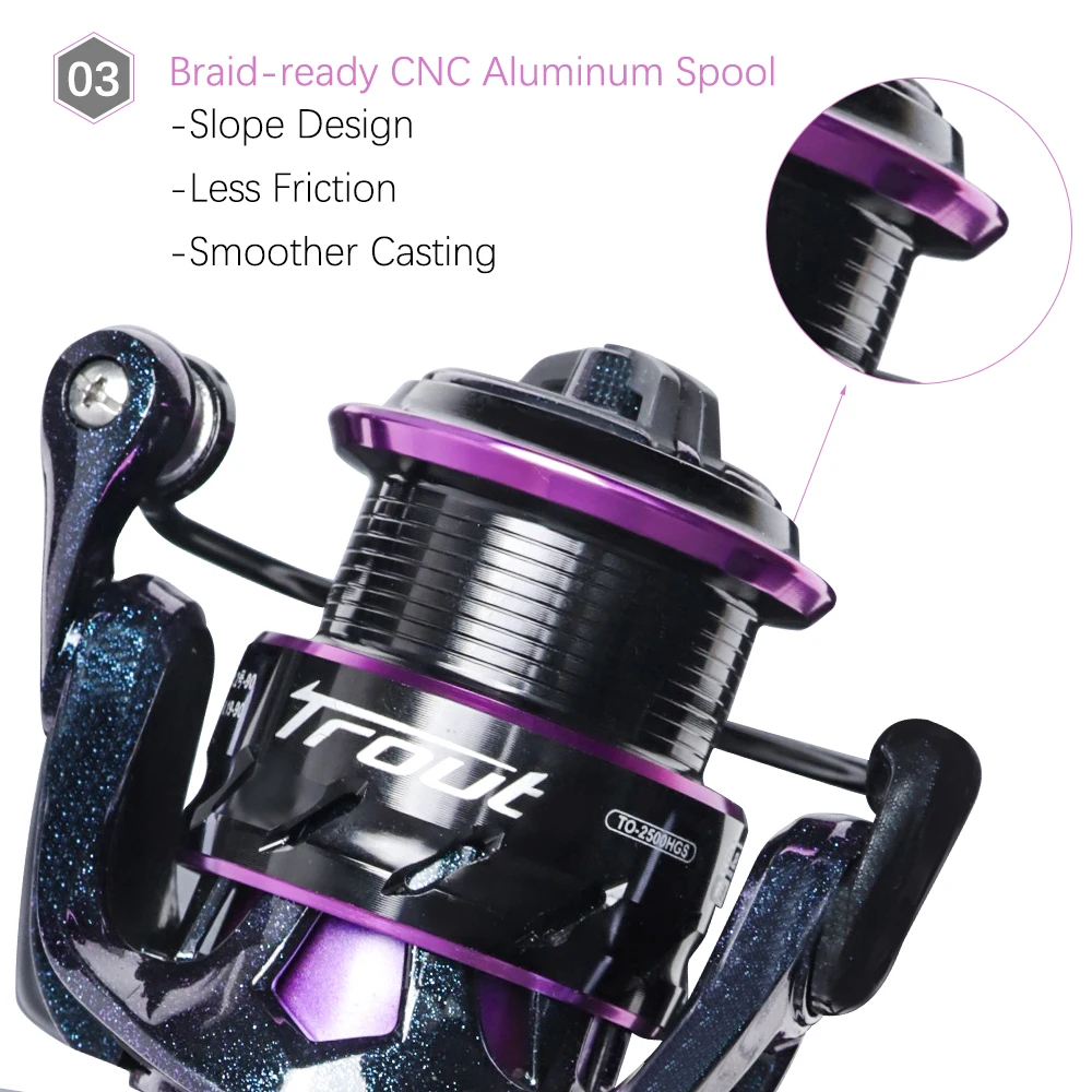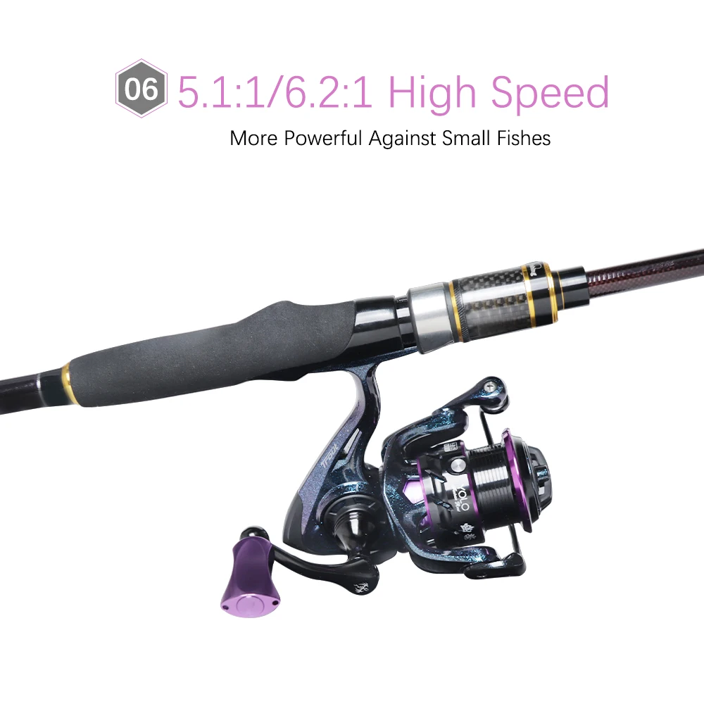 Suave y fiable: cuenta con rodamientos de bolas 9 + 1 resistentes a la corrosión, se sorprenderá de la increíble suavidad de este carrete. El rodamiento de bolas Premium le ayuda a lanzar a su punto de destino sin problemas y sin esfuerzo. Recuperación rápida: 5,1: 1/6.2:1 relación de engranaje de alta velocidad es perfecta para escenarios de pesca ligeros, lo que permite una sensación de carrete más rápida y potente y un seguimiento más rápido de los lanzamientos, ahorra tiempo y le ayuda a atrapar más peces. Precisión: El carrete de aluminio CNC ayuda a que su línea de pesca se extienda uniformemente en el carrete para que pueda disfrutar de su viaje de pesca sin preocupaciones. El engranaje de piñón de latón y las piezas de equilibrio de la computadora tienen que ver con la precisión, hacen que este carrete funcione como un hermoso reloj suizo. Otras características: El mango de aluminio CNC aumenta el par y le da ventaja al enrollar sus peces. El Sistema de arrastre de lana multidisco y el sistema de embrague unidireccional proporcionan suficiente potencia de frenado para todos los escenarios de pesca ligeros. Delgado pero resistente: un carrete giratorio especialmente diseñado para truchas, BlueGill, crappie y otros peces ligeros. El cuerpo del carrete y el rotor están hechos de grafito mejorado para aumentar su resistencia y durabilidad al mismo tiempo que lo mantienen ligero y flexible.