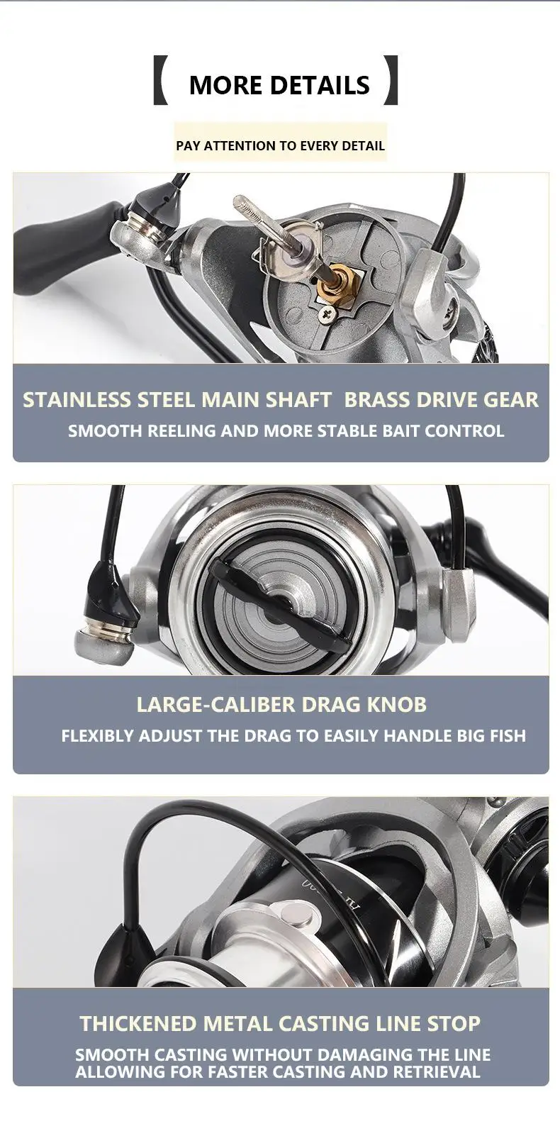 8. Eje principal de acero inoxidable y engranaje impulsor de latón: resistente a la corrosión, duradero; Garantiza un bobinado suave y un control estable del cebo.