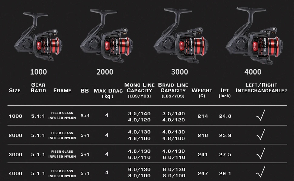 La diferencia de tamaño permite diferentes pruebas de libras y yardas para los carretes. Cuanto mayor sea el número, mayor será la prueba de libras que pueda poner en el carrete.