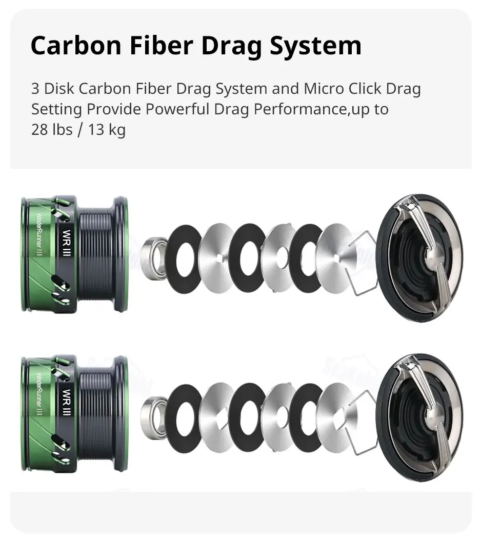 3.Sistema de arrastre de fibra de carbono: el sistema de arrastre de fibra de carbono de 3 discos y la configuración de arrastre de microclic brindan un rendimiento de arrastre potente, hasta 28 lbs/13 kg.