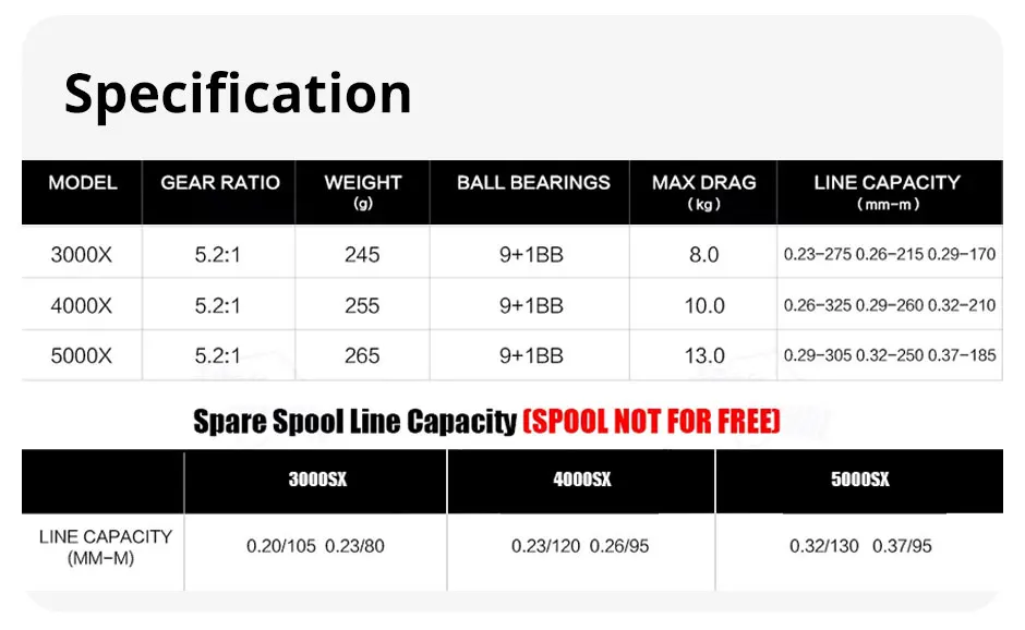 3000| Relación de engranajes: 5,2:1| Peso: 245 g| Rodamientos: 10BB| Arrastre máximo: 8KG| Capacidad de línea: 0,23-275 0,26-215 0,29-170