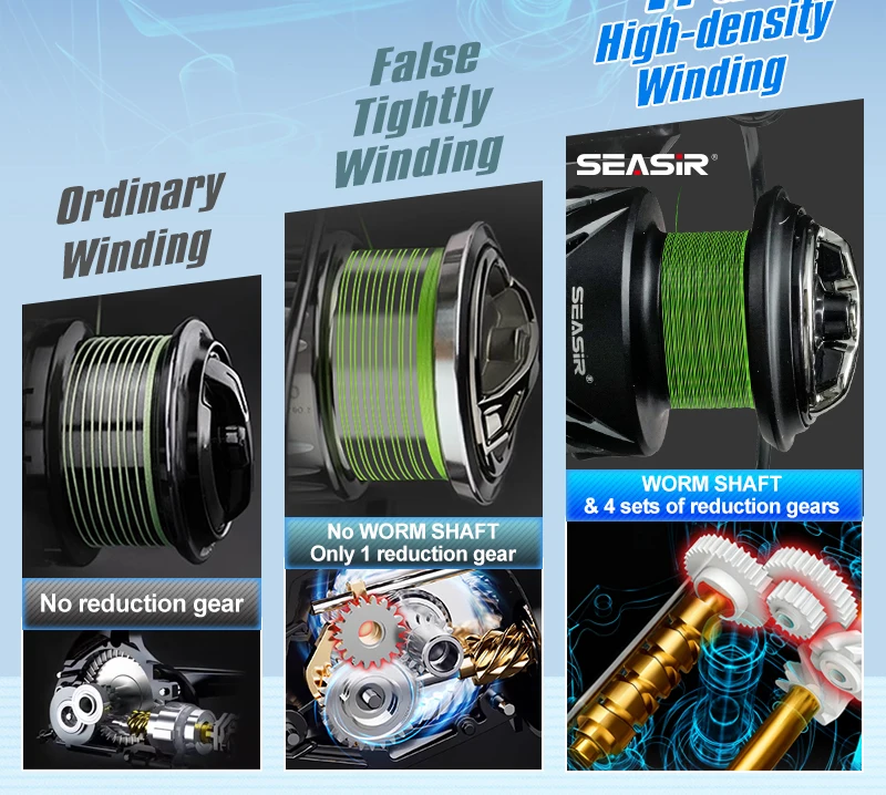 Otras marcas de carretes envueltos de alta densidad solo tienen un conjunto de engranajes reductores y sin eje de gusano.Efecto de desaceleración limitado