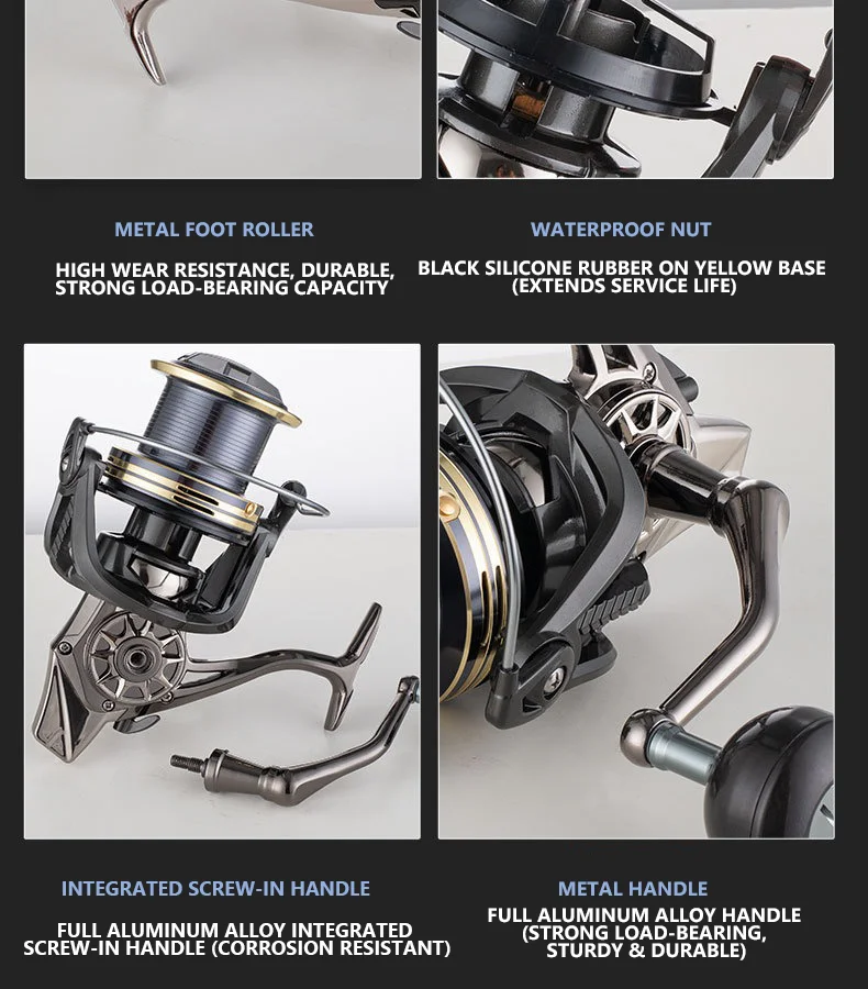 Los componentes mejorados (rodillo de pie de metal resistente al desgaste, tuerca impermeable con caucho de silicona negro para una vida útil prolongada) mejoran la practicidad y la durabilidad. Las piezas totalmente metálicas fabricadas con precisión garantizan que el carrete cumpla con los estándares profesionales de fundición a largo plazo tanto en apariencia como en rendimiento.