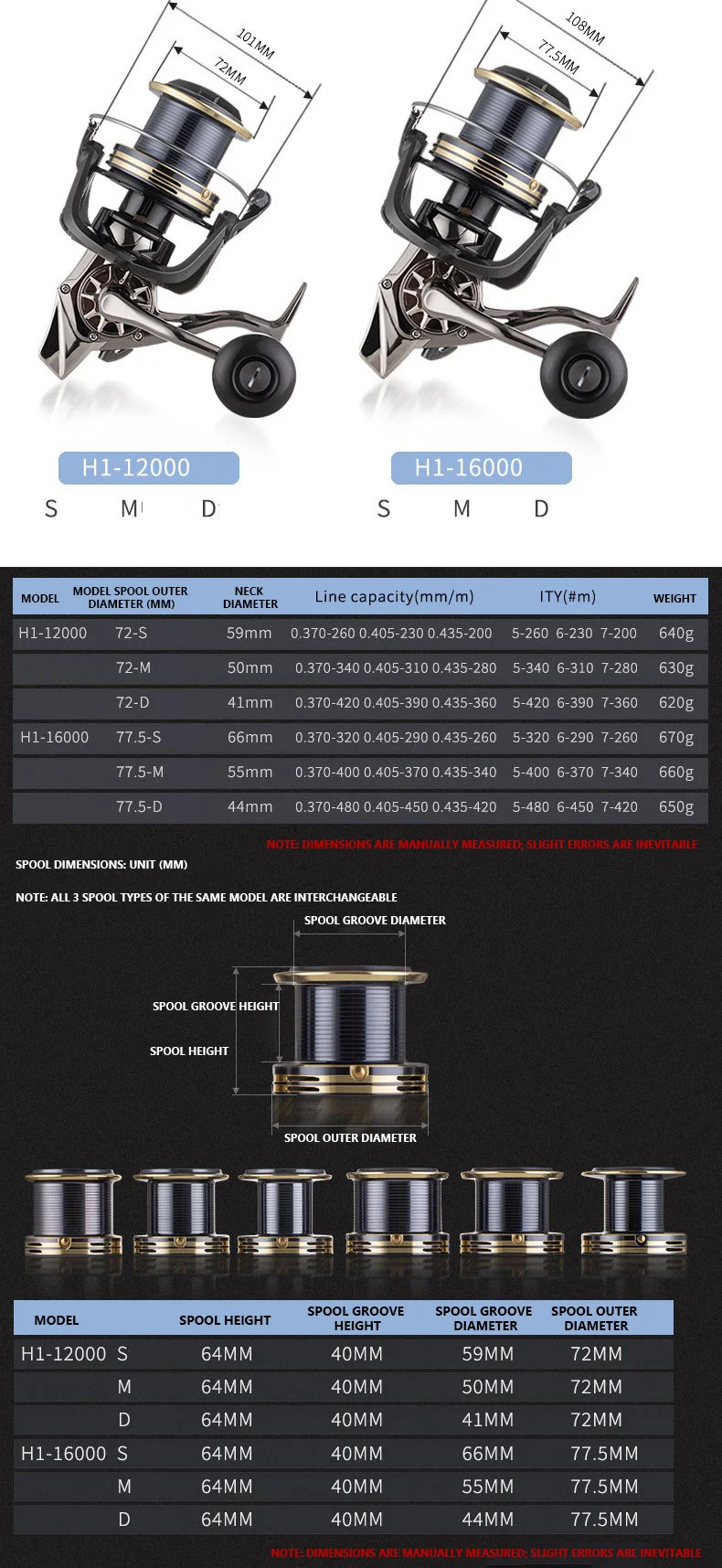 Disponible en dos tamaños (H1-12000 / H1-16000), cada uno con carretes intercambiables S (poco profundos), M (medios) y D (profundos) (diámetro exterior de la bobina: 72MM-77,5MM).Elija el carrete adecuado según el peso del señuelo y la especie objetivo para obtener la máxima versatilidad.