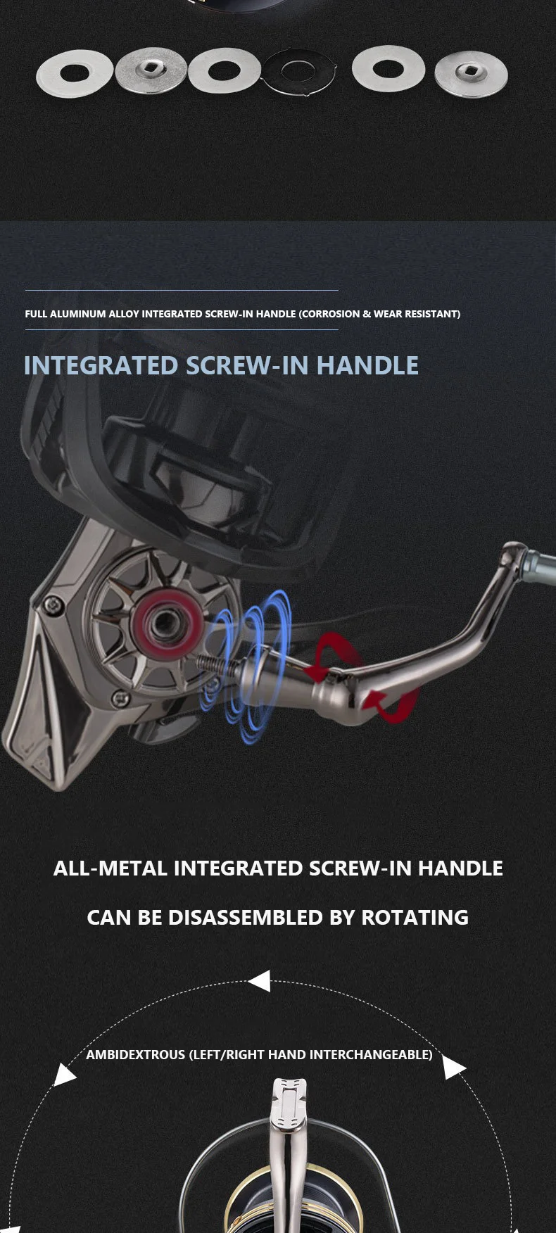 El **mango atornillable integrado totalmente de aluminio** es resistente a la corrosión, soporta carga y está construido para durar.Admite intercambiabilidad con la mano izquierda/derecha y se puede desmontar/montar mediante rotación, fácil de usar para pescadores con diferentes preferencias de agarre.