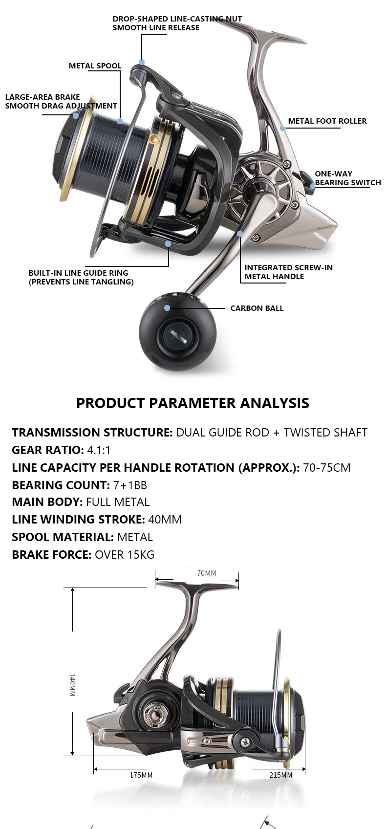 Equipado con una **varilla guía doble + sistema de transmisión de eje trenzado** y 7+1 rodamientos sellados totalmente metálicos, ofrece una alta eficiencia de transmisión y un funcionamiento estable.La relación de transmisión de 4,1:1 (con recuperación de línea de 70-75 CM por rotación del mango) combina un rendimiento de lanzamiento largo con una poderosa recuperación de peces.