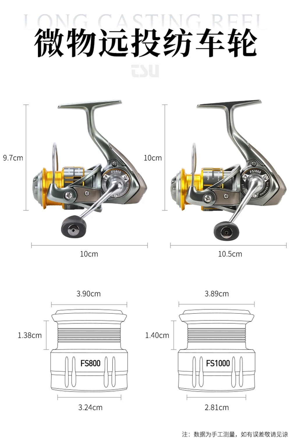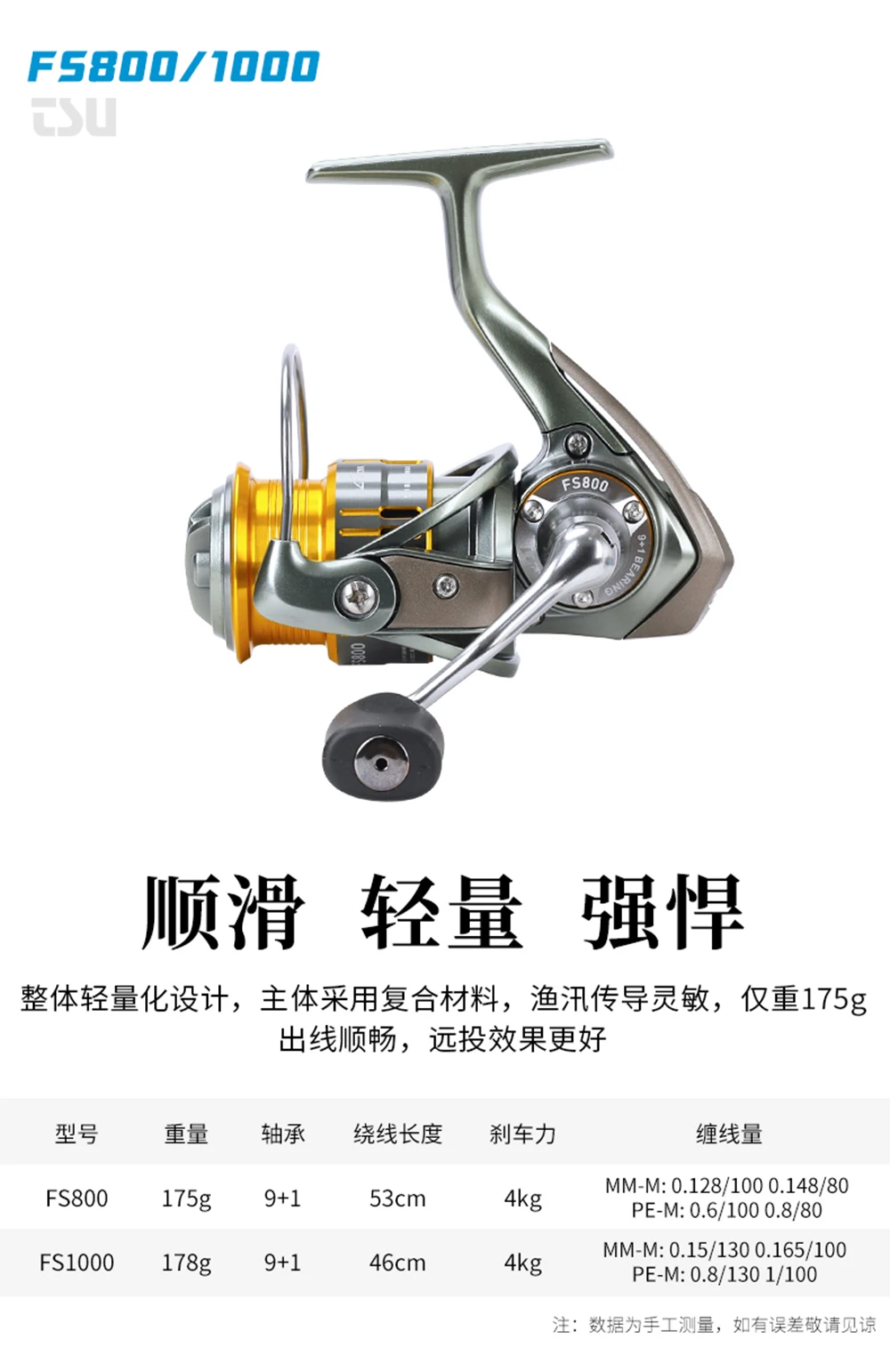 1.FS800| Peso: 175 g| Relación de engranajes: 5,2:1| Rodamiento: 9+1BB| Arrastre máximo: 4KG| Capacidad de línea (mm-M): 0,128/100 0,148/80