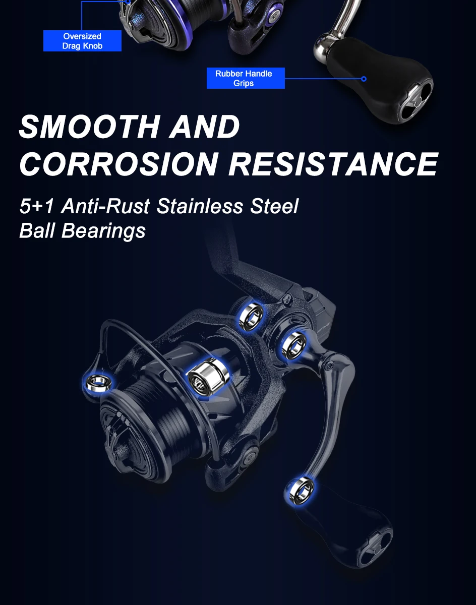 ● Ligero hasta 171G: la nailon con marco de fibra de vidrio reduce el peso de la rueda de pesca al tiempo que aumenta la resistencia general.La combinación de funcionamiento suave y característica liviana le sorprenderá.