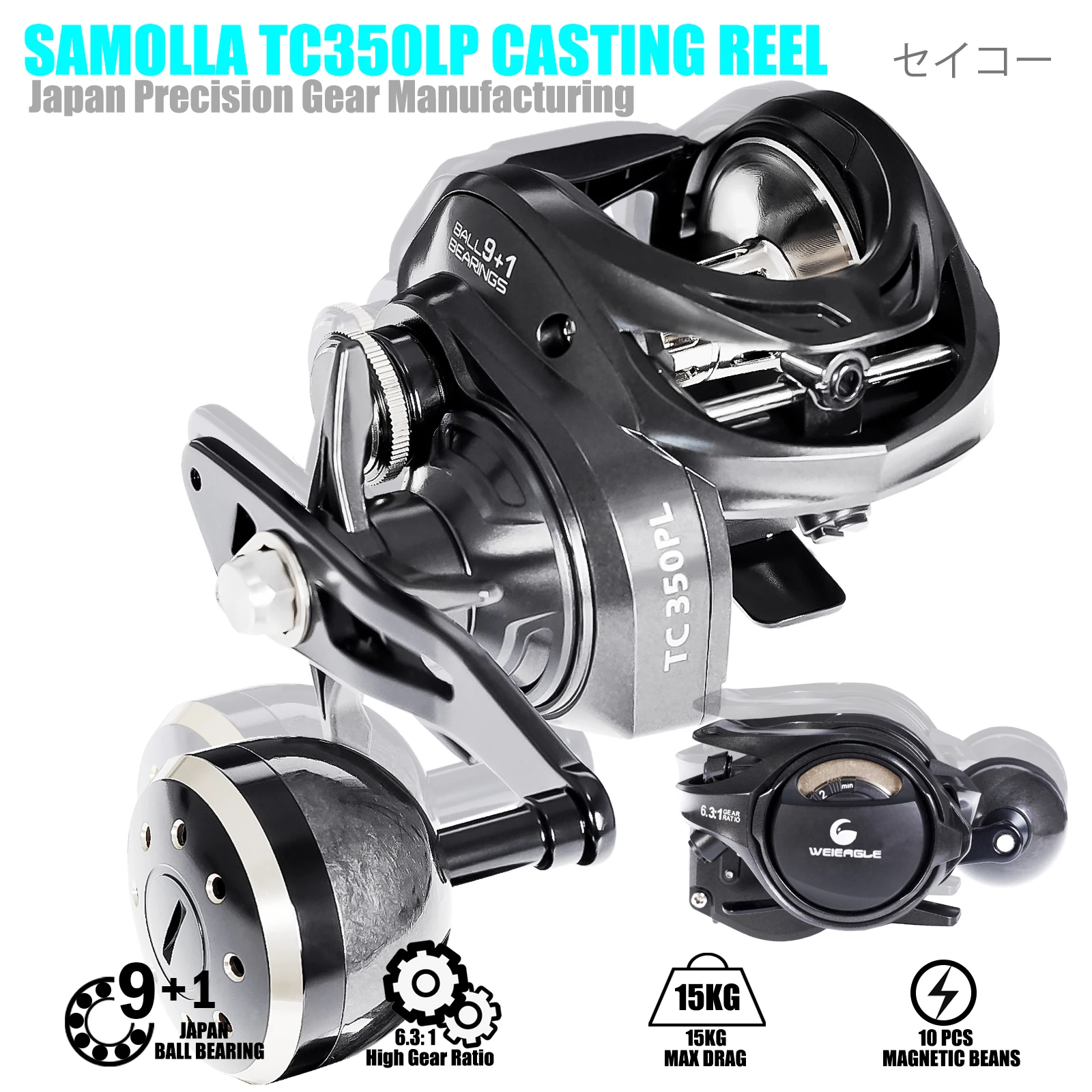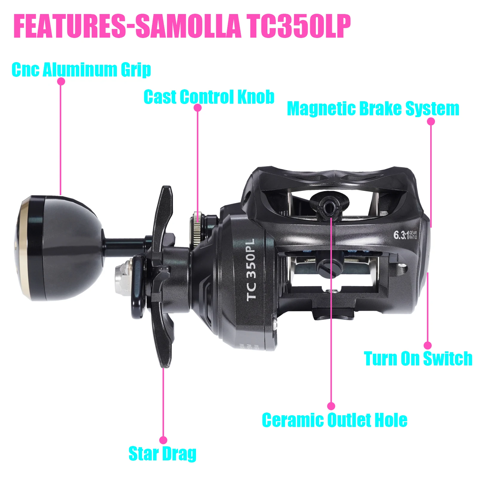 5. Ergonómico e innovador: El carrete de cebo Samolla TC350LP viene con un botón de enganche de barra de pulgar de fácil acceso en la placa lateral del engranaje que le ayuda a retroceder la barra de pulgar sin girar el mango. El carrete de envoltura de línea súper resistente elimina el uso de mono como respaldo. El sistema de guía de línea de soporte de ejes dobles aumenta en gran medida la estabilidad y durabilidad. 10 sistema efectivo de frenado magnético evita los excesos y el contragolpe. La almohadilla interior para la barra del pulgar le brinda una mejor comodidad.