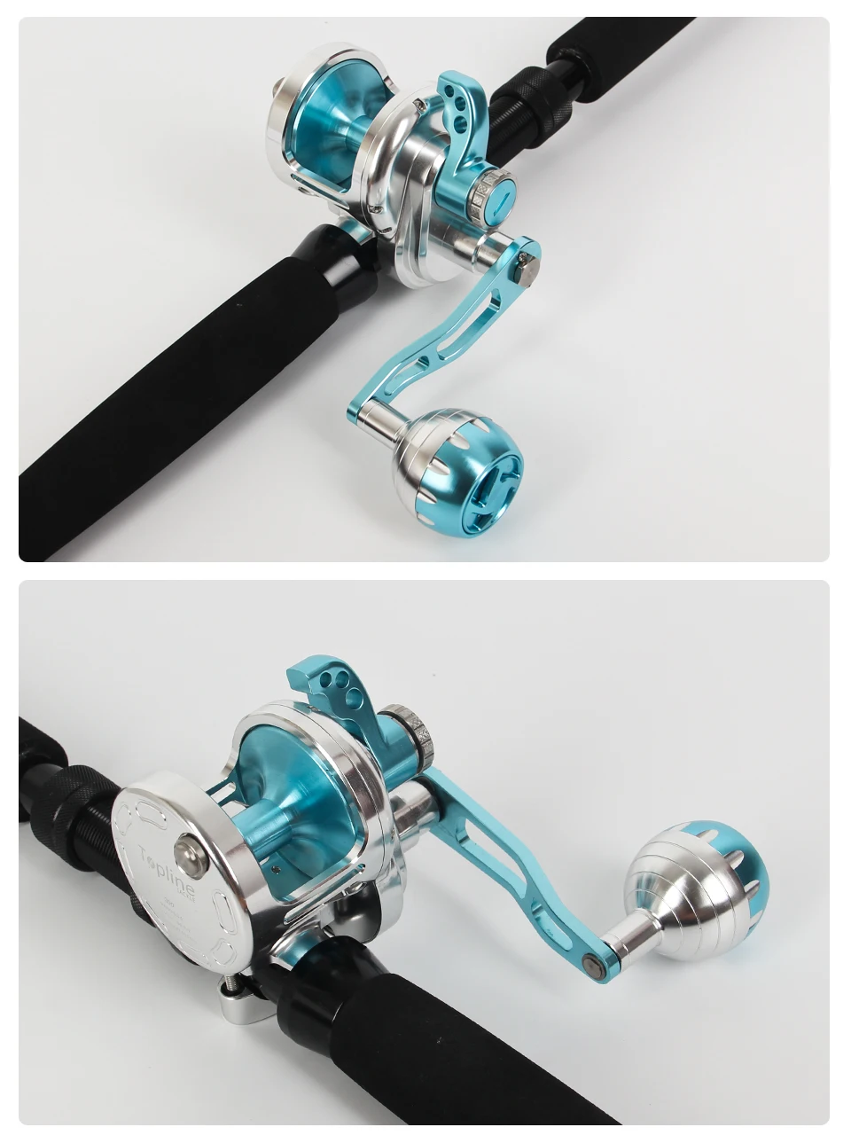 【ergonomic design】–his multiplier drag jigging reel uses new lightweight hollow aluminum alloy bending rocker arm for taking-up more easily. O-type aluminum alloy grip: High quality of Topline Tackle slow pitch jigging reel with new type of aluminum alloy ergonomic design, O-type grip has a pattern on the grip, which can not only prevent slip, but also have a full metal grip feeling.