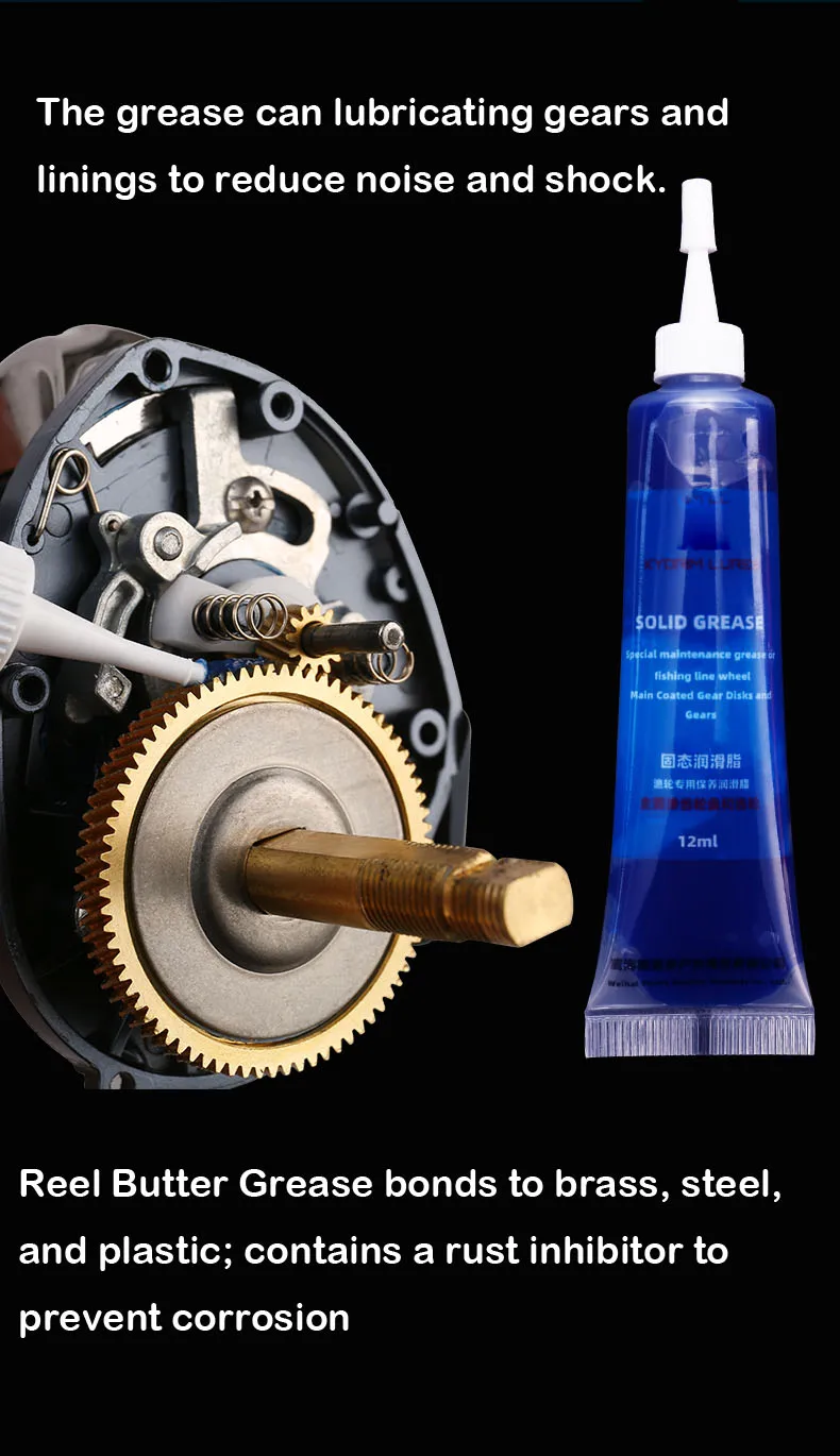 La grasa de la mantequilla del carrete se adhiere al latón, el acero y el plástico; Contiene un inhibidor de óxido para evitar la corrosión