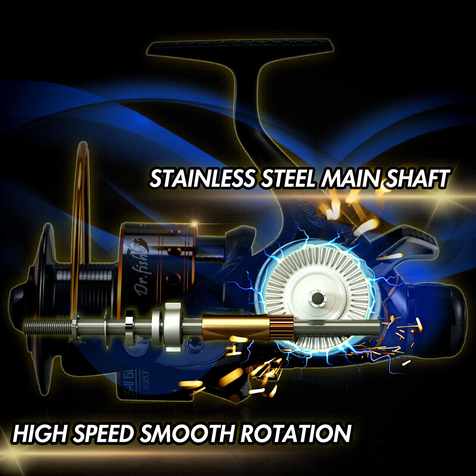TODO BAJO SU CONTROL. Clic de carrete claro.10+1 rodamientos de bolas SIN CORROCIÓN DE ALTA POTENCIA; Sistema de arrastre suave de múltiples discos con arandelas de arrastre de fieltro engrasadas superiores.La relación de transmisión de 5,5:1 garantiza una recuperación rápida y segura.Adecuado para capturar carpas, lubinas rayadas, bagres, peces azules, maquallas y pequeños tiburones.