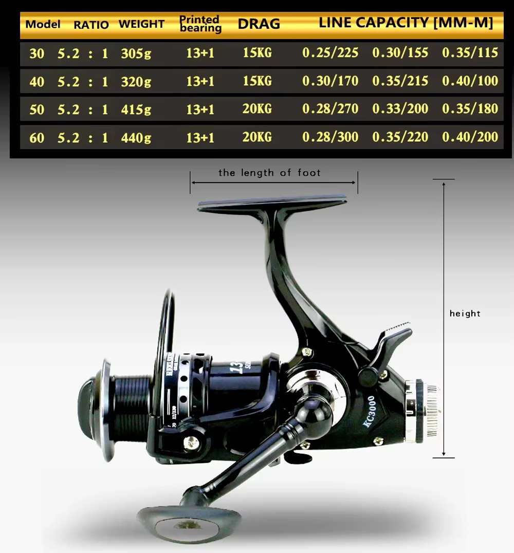 3000 | Relación de engranaje: 5,2: 1 | Peso: 305g | Arrastre máximo: 15KG | Capacidad de Línea: 0,25-225 0,30-155 0,35-115