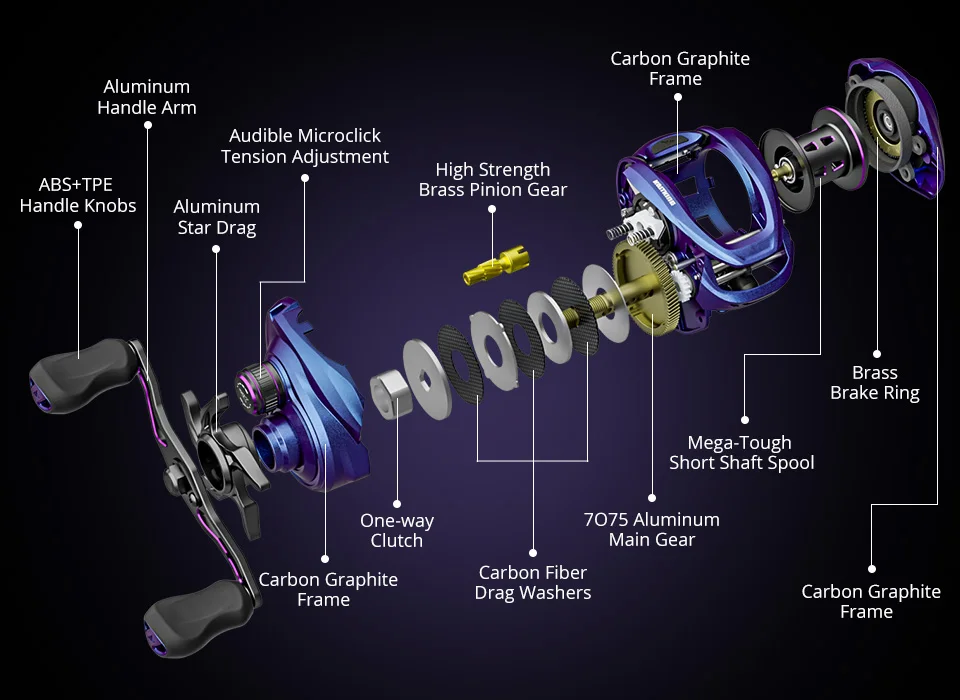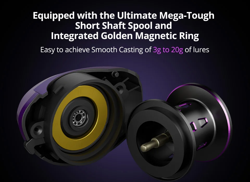 Equipado con el carrete de eje corto Ultimate Mega-Tough y el anillo magnético dorado integrado