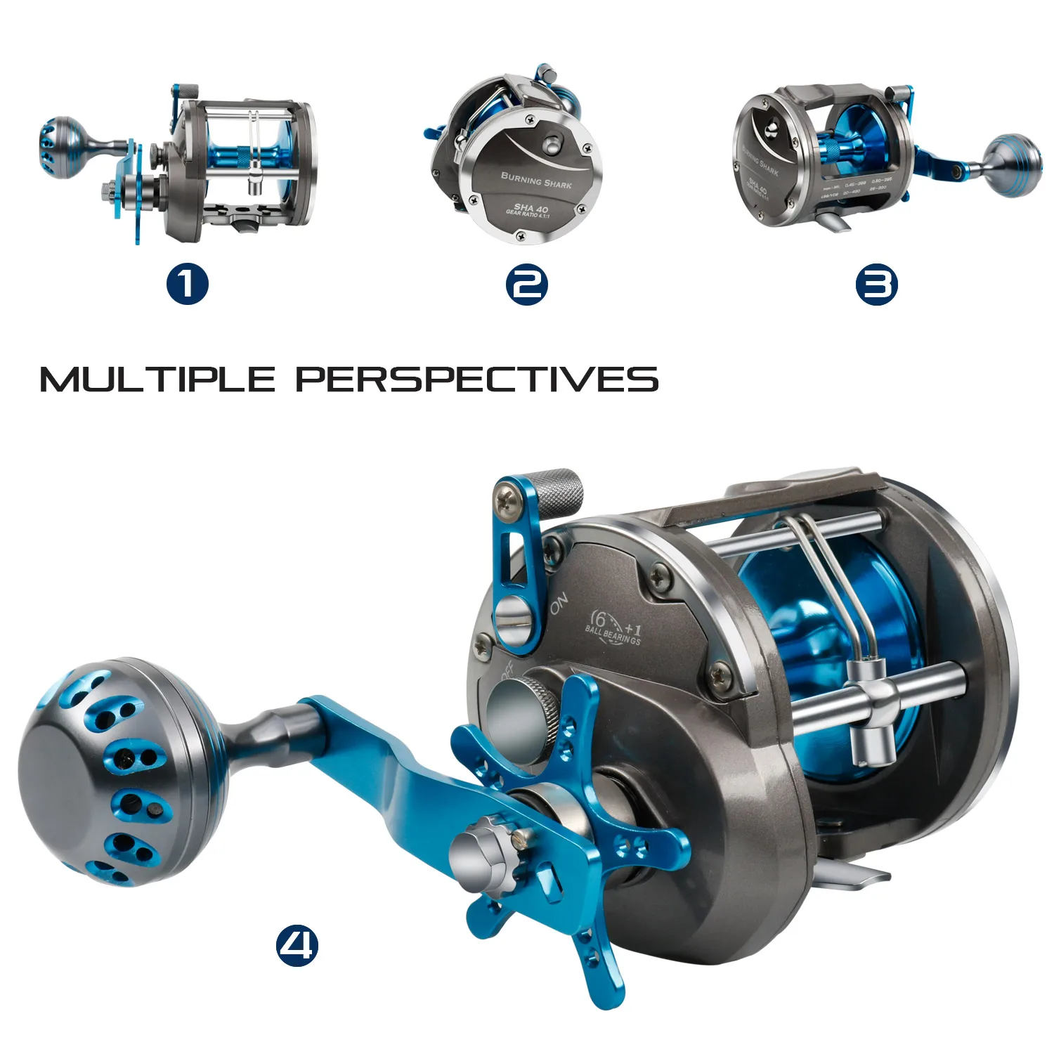 Características del producto:1.Diseño de estructura sin costurasDiseñado con una construcción integrada sin espacios y equipado con rodamientos anticorrosión avanzados para un rendimiento suave y duradero.2.Carrete de aleación de aluminio forjado resistente a la corrosiónFabricado en aleación de aluminio forjado para garantizar durabilidad y resistencia a entornos de agua salada.3.Engranaje interno de cobre de precisiónCuenta con componentes internos de engranaje de cobre de alta precisión para una transferencia de potencia eficiente y confiabilidad.Sistema de rodamientos 4.6+1 con embrague unidireccionalEquipado con 6 rodamientos de bolas más un rodamiento de embrague unidireccional, que ofrece un funcionamiento ultrasuave y un control anti-retroceso confiable.5.Brazo de mango de aluminio reforzadoConstruido con un brazo de mango de aluminio liviano y resistente para un agarre cómodo y una mayor durabilidad.6. Engranaje de alta resistencia y sistema de arrastre de 5 estrellasIncorpora un tren de engranajes de alta resistencia y un sistema de arrastre de precisión de 5 estrellas, que ofrece un ajuste preciso con un ruido mínimo.7.Cuerpo de aluminio anodizado mecanizado por CNCConstruido con aluminio anodizado mecanizado con precisión CNC para un marco liviano, rígido y resistente a la corrosión.8. Listo para pescar en agua saladaDiseñado para funcionar de manera confiable en ambientes marinos, lo que lo hace adecuado para aplicaciones de pesca costera y de alta mar.especificaciones:Modelo no.: SHA40Relación de transmisión: 4,1:1Rodamiento de bolas: 6 + 1 BBCapacidad de la línea (mm/M): 0,45-399 0,5-295Capacidad de línea (LBS/YDS): 20-430 25-320Peso: 642 g / 23 oz 610 g / 21 ozArrastre máximo: 25 kgEl paquete incluye:1 * carrete de pesca