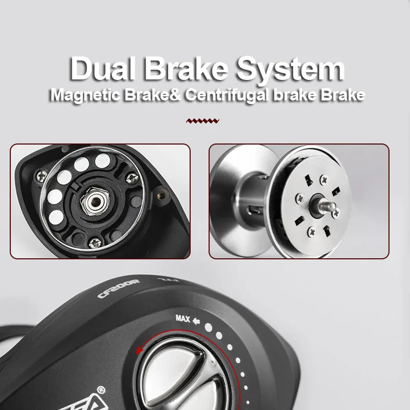 Este carrete incorpora un innovador sistema de doble freno para máximo control y prevención de backlash: