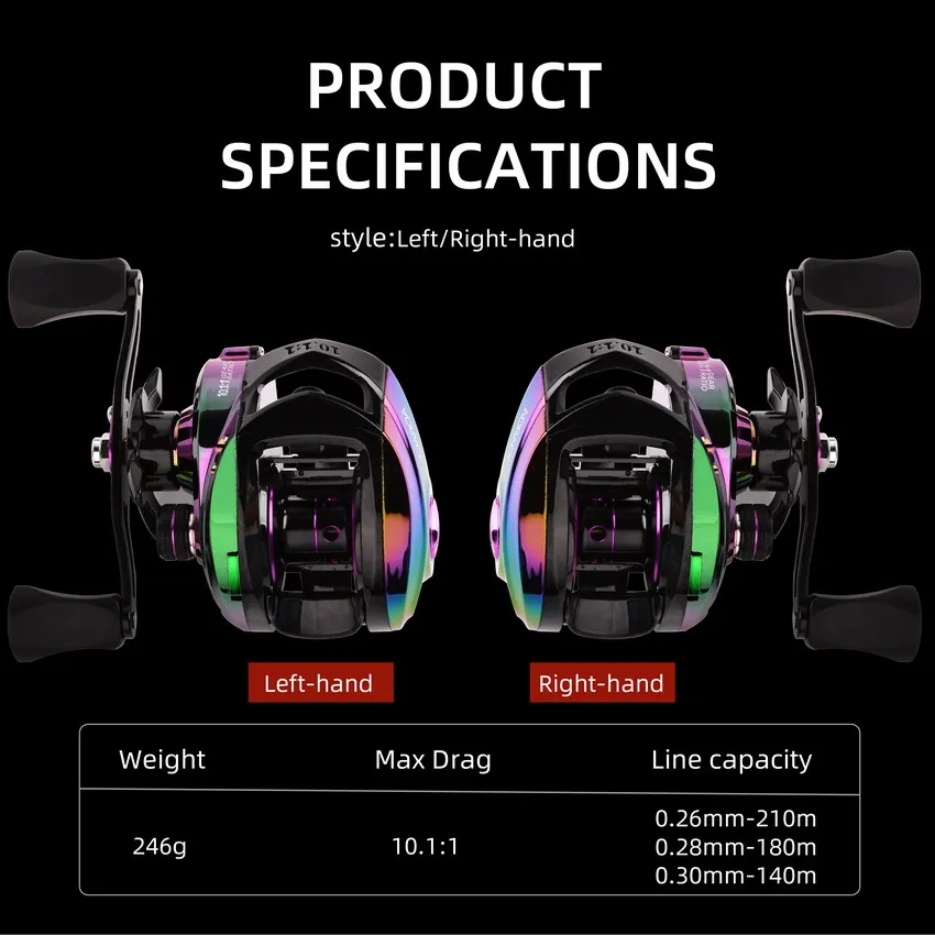 ¡Este es un rollo de pescar SUPER, SUPER Baitcasting! Tiene una traducción: 1: 10,1 y 12 imanes de freno. El carrete está hecho de metal terciopelo y tiene una potencia de tracción máxima de 10 kg. ¡Es adecuado para pesca de: corchetes, folletos, dobles, rapones, forelas y para peces un poco más grandes! Es fácil de usar y tiene un coste importante: ¡aprox. 10 veces más barato que un rollo de marca! Muchas gracias ! ¡Una verdadera recomendación de compra!