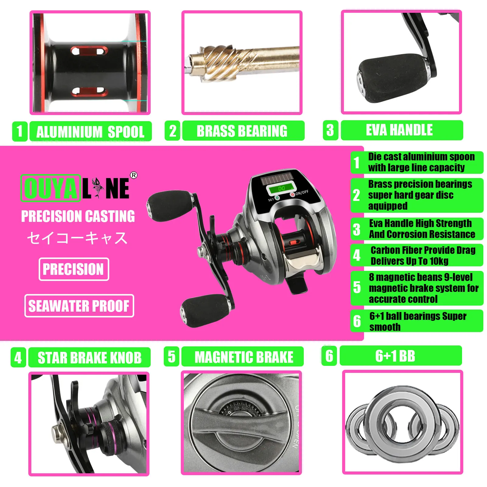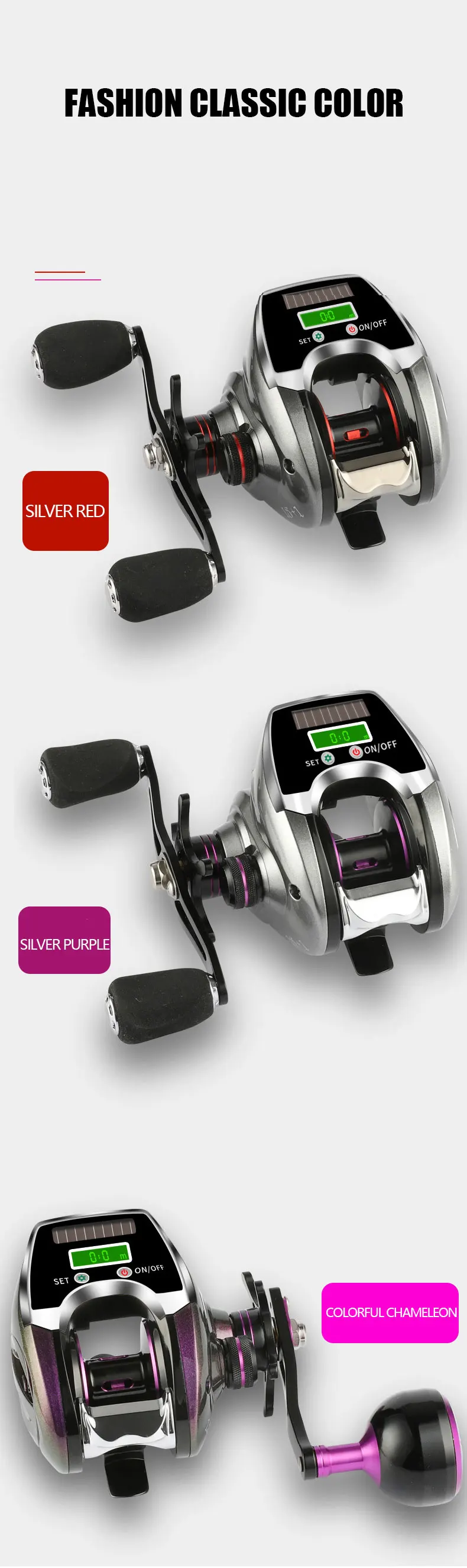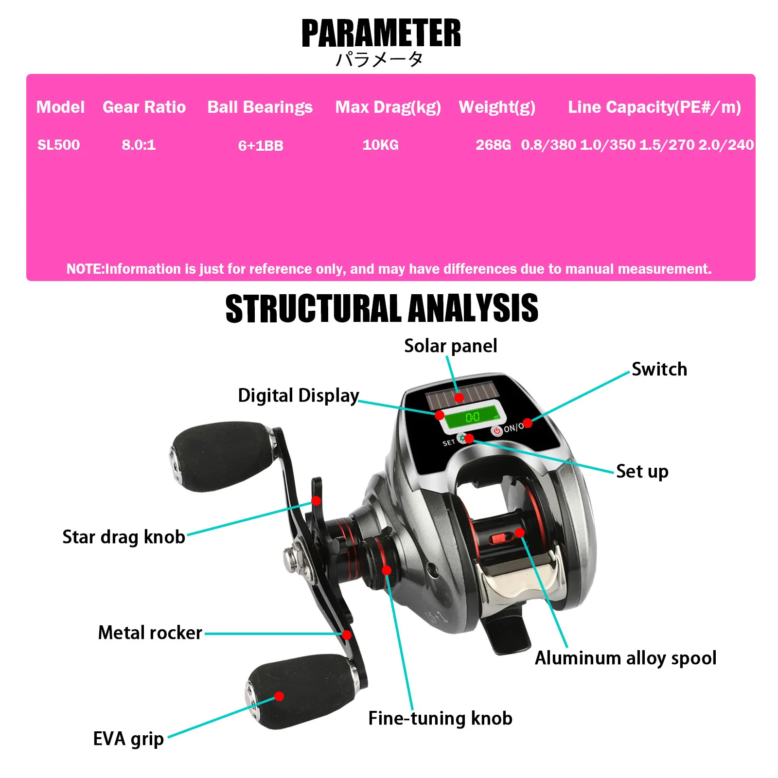 Carrete de pesca electrónico de Baitcasting SL500 8,0: 1 6 + 1BB 10kg, Ratio de carga Solar USB, sistema de freno magnético, fundición Moulinet