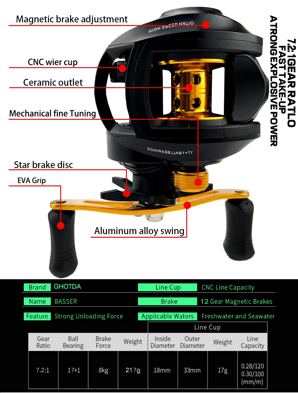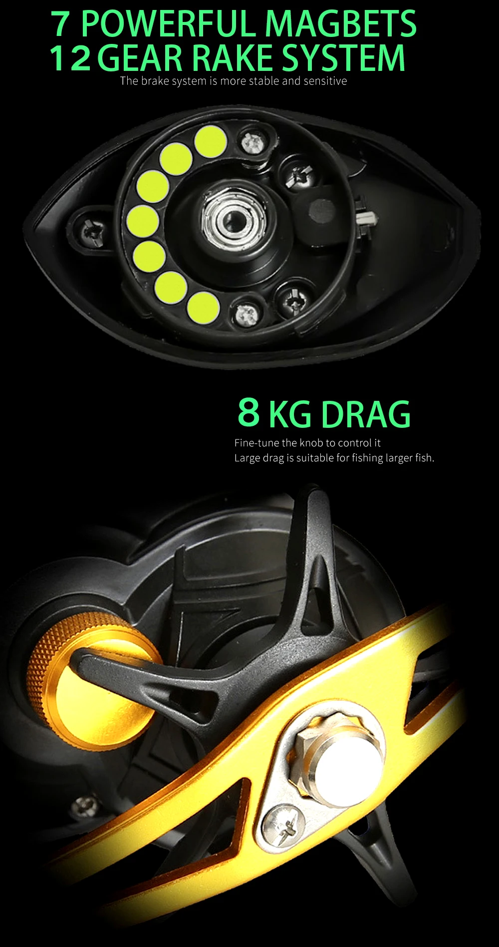 * 12 frenos magnéticos de engranaje, el control es más flexible y conveniente, también adecuado para la pesca en balsa.