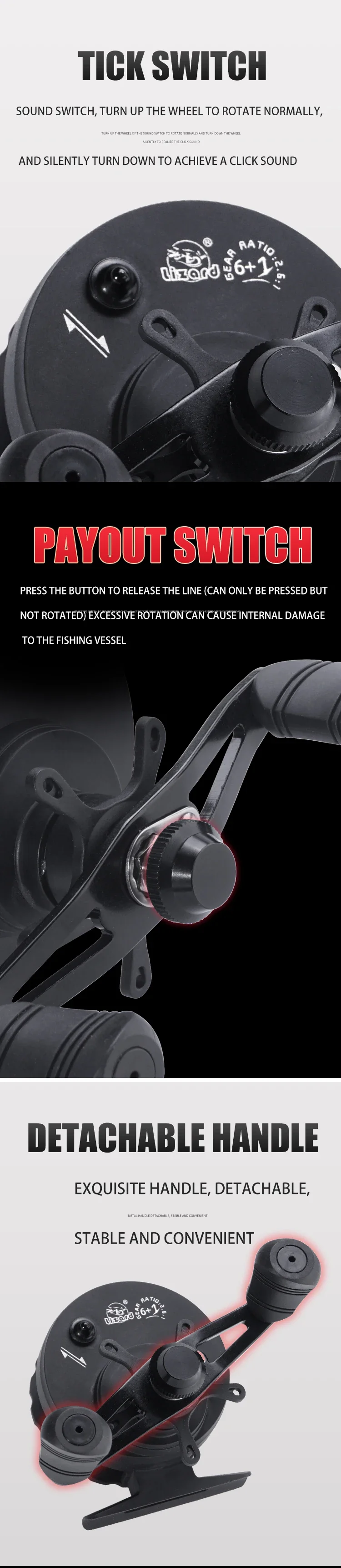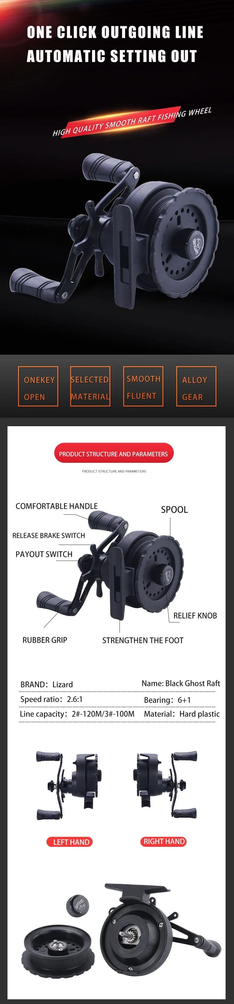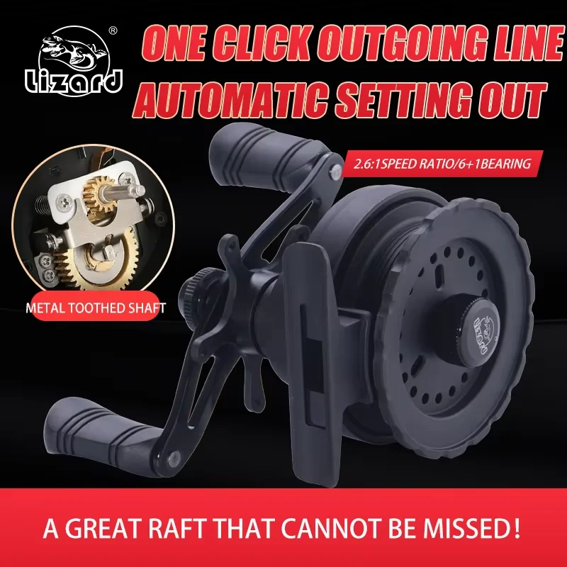 Carrete de pesca con balsa Lizard totalmente negro, relación de velocidad 6 + 1BB y 2,6: 1 con perilla de goma, puede agitar automáticamente la línea