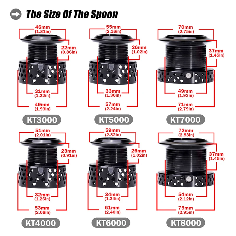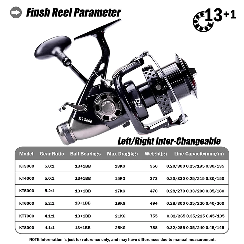 Kt 8000 | Peso: 780g | Relación: 4,1: 1 | Arrastre máximo: 28kg | Capacidad de Línea: 0,65mm/260m 0,20mm/190m