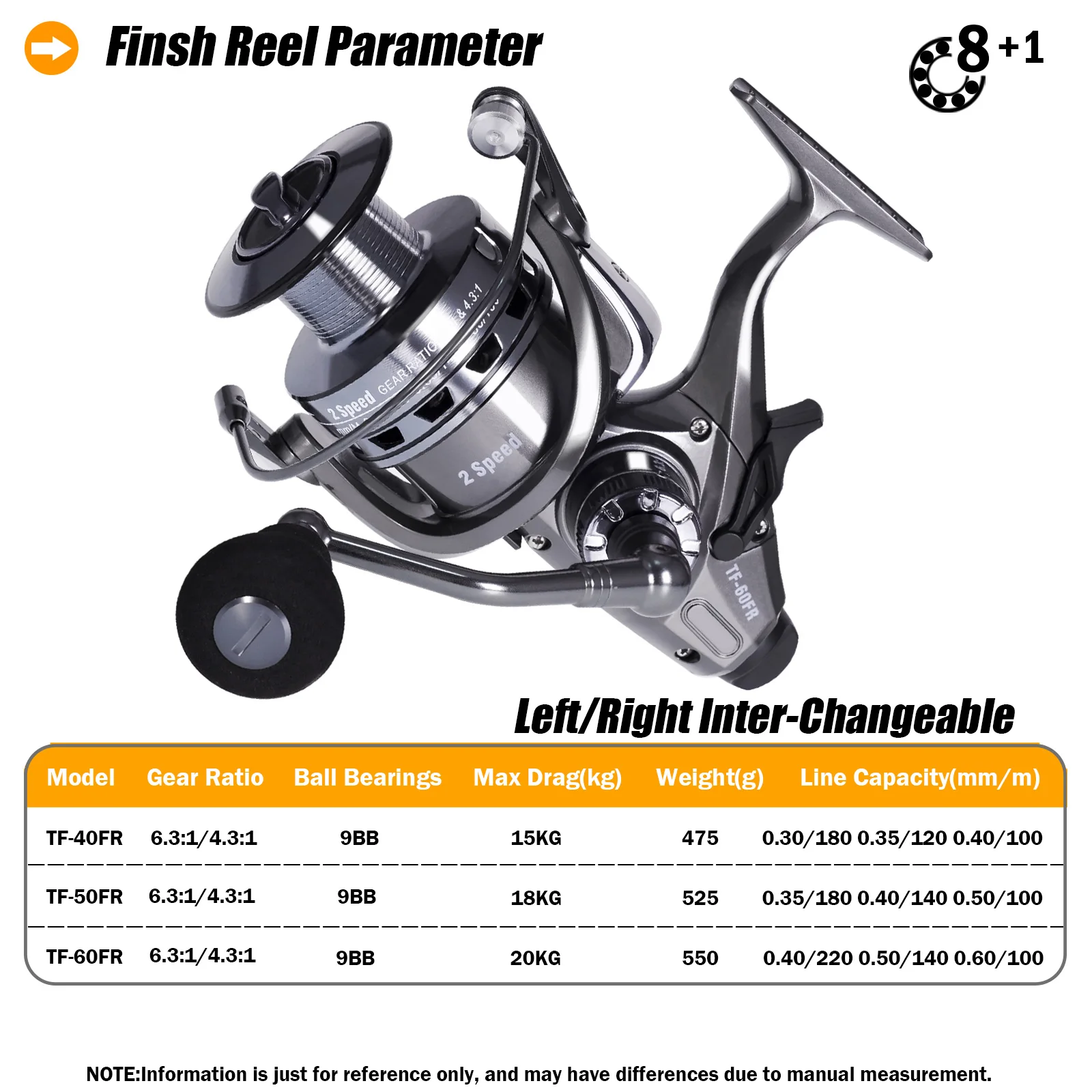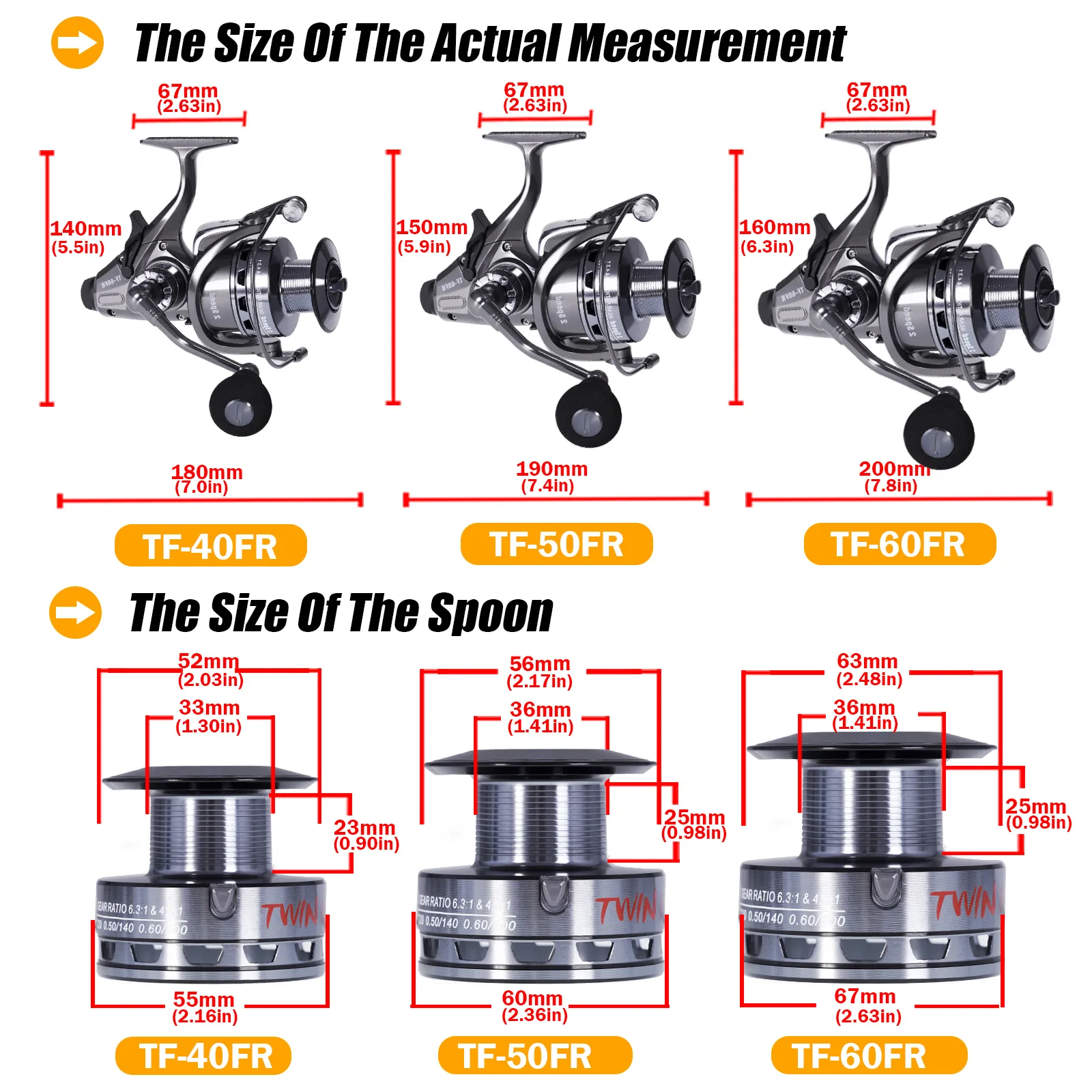 TF-60FR | Peso: 550g | Relación: 6,3: 1/4.3:1 | Arrastre máximo: 20kg | Capacidad de Línea: 0,40/220 0,50/140 0,60/100(MM/M)