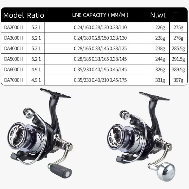 DAI3000 | Peso: 228g | Relación: 5,2: 1 | Arrastre máximo: 15kg | Capacidad de línea (mm/m): 0,24/180 0,28/150 0,33/130DAII4000 | Peso: 238g | Relación: 5,2: 1 | Arrastre máximo: 15kg | Capacidad de línea (mm/m): 0,28/165 0,33/145 0,38/125DAII5000 | Peso: 244g | Relación: 5,2: 1 | Arrastre máximo: 15kg | Capacidad de línea (mm/m): 0,28/185 0,33/165 0,38/145DAII6000 | Peso: 326g | Relación: 5,2: 1 | Arrastre máximo: 20kg | Capacidad de línea (mm/m): 0,35/230 0,40/195 0,45/160DAII7000 | Peso: 331g | Relación: 5,2: 1 | Arrastre máximo: 20kg | Capacidad de línea (mm/m): 0,35/230 0,40/210 0,45/175