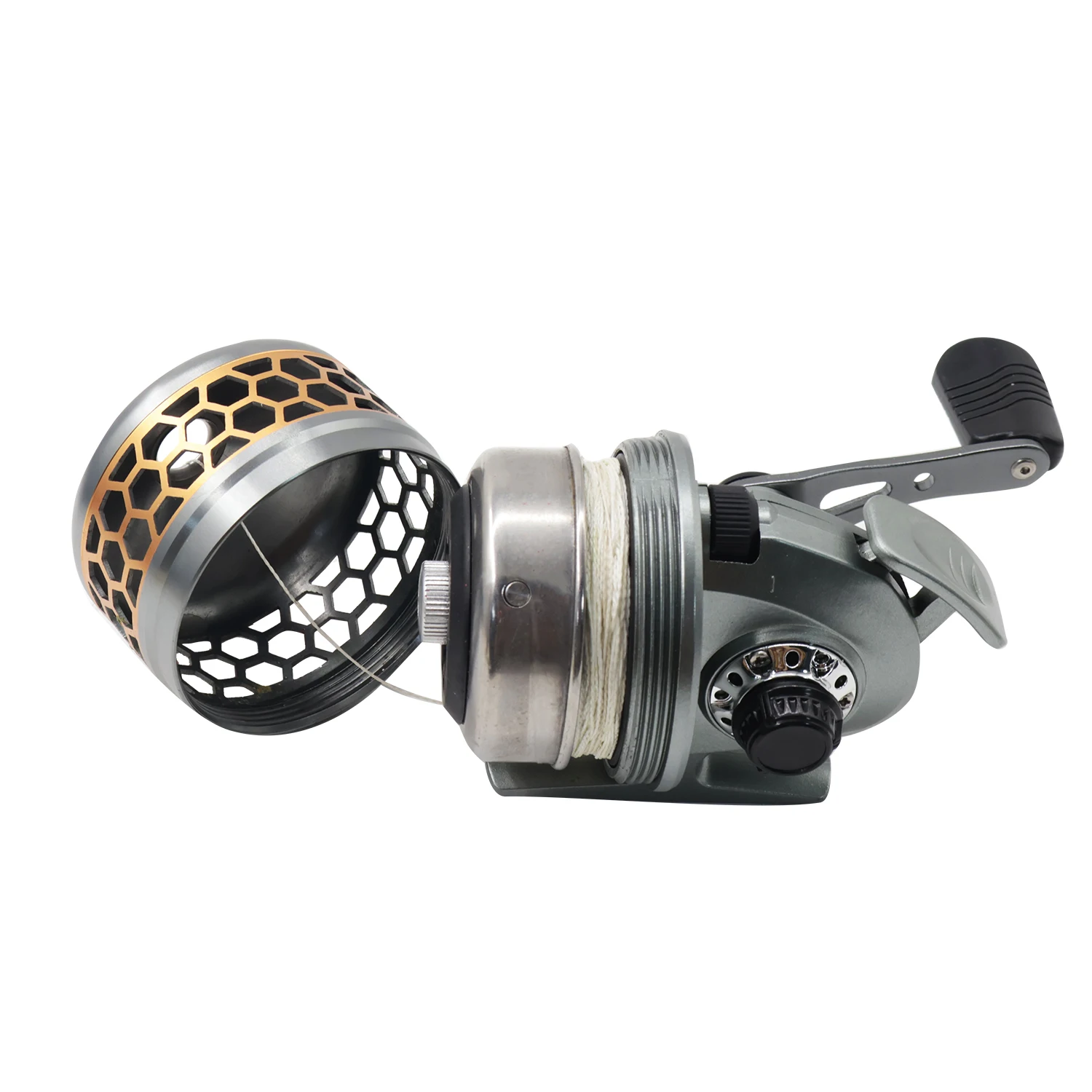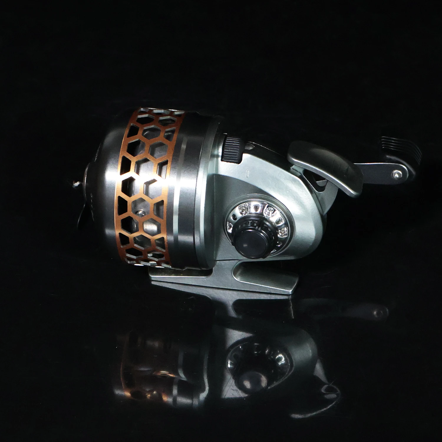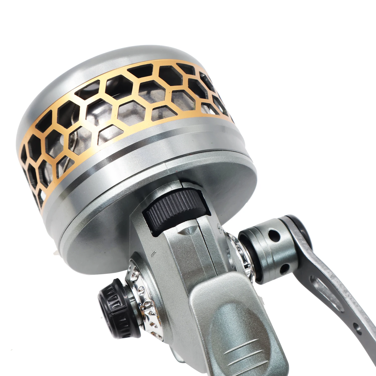 El cuerpo principal del carrete es gris plateado, compacto y metálico.Hay un anillo decorativo hueco hexagonal dorado en el medio del carrete, que agrega singularidad visual y belleza.