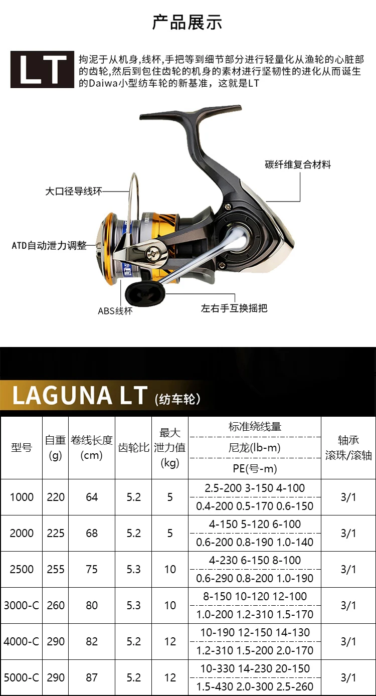 Carrete de pesca DAIWA LAGUNA LT, carrete de pesca con arrastre máximo 3 + 1BB, relación de engranaje de 5-12KG 5,2/5,3