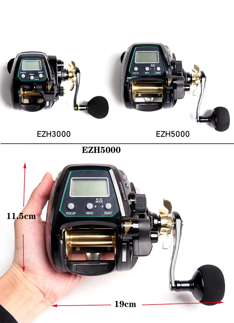 Los modelos son: EZH5000 negro para mano derecha e izquierda; EZH3000 negro para mano derecha e izquierda; 14,8 V carrete de pesca universal separado batería de 2 agujeros;