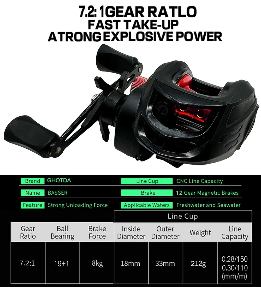 Carrete de pesca FG2000 Baitcasting, relación de engranaje 7,2: 1, rueda de Pesca Salada 19 + 1BB, arrastre máximo 8kg, fuerza de descarga fuerte