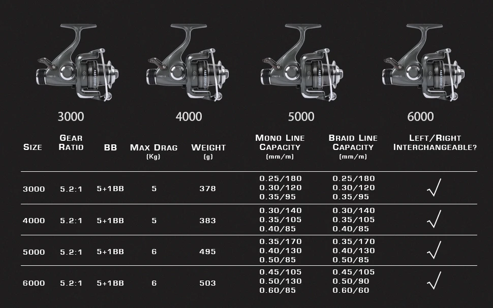 La diferencia de tamaño permite diferentes pruebas de libras y yardas para los carretes. Cuanto mayor sea el número, mayor será la prueba de libras que pueda poner en el carrete.