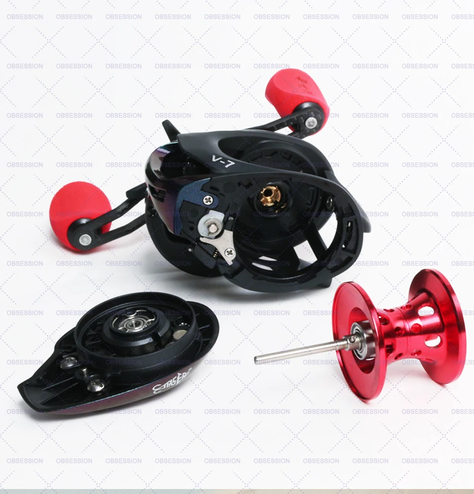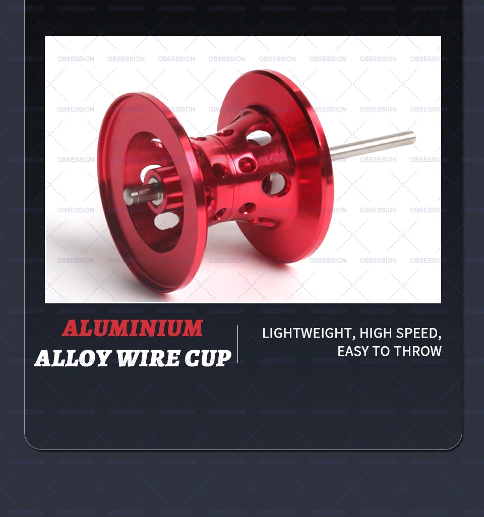 2.Carrete de aluminio con eje corto, diseño hueco tallado.
